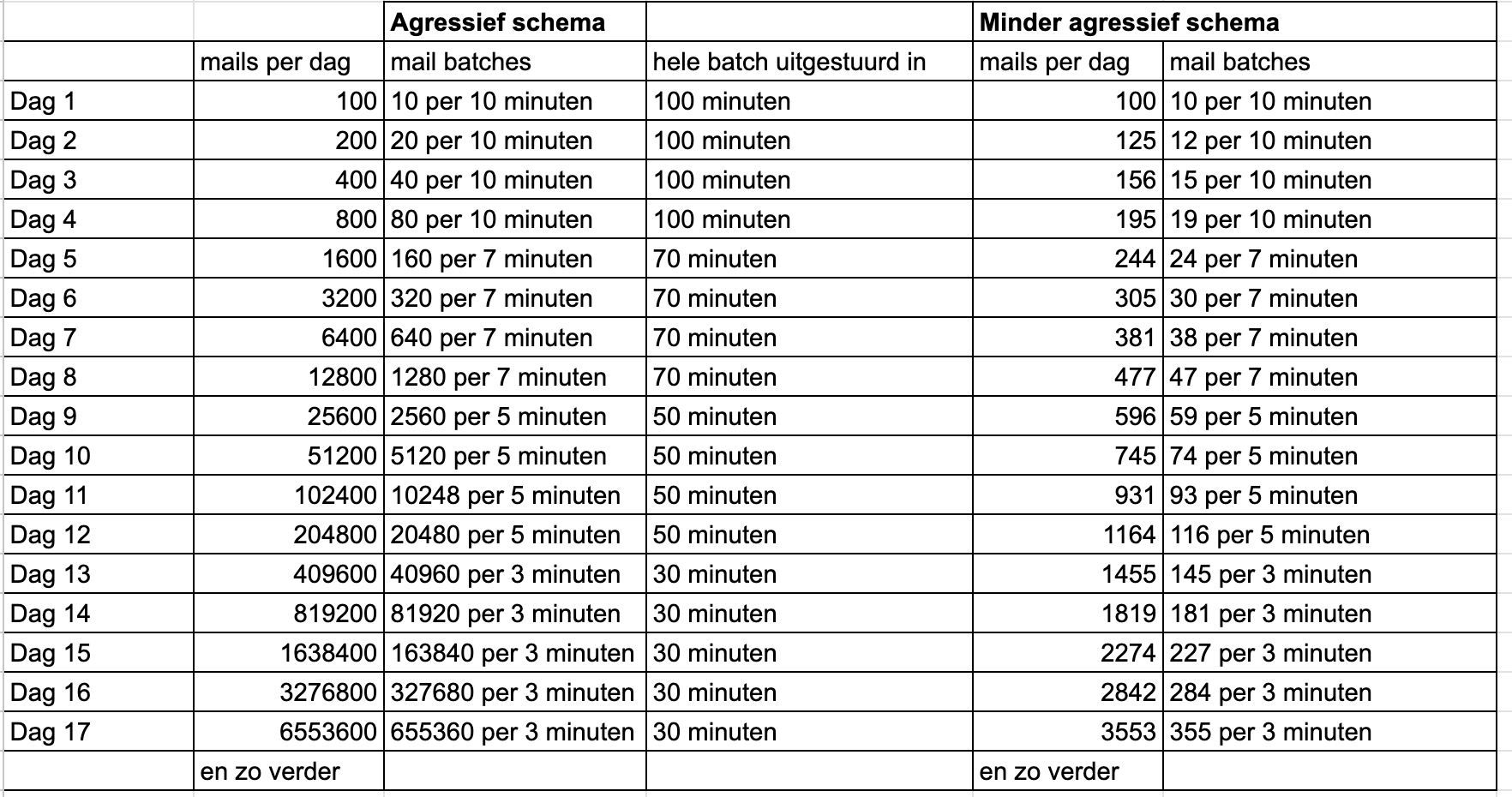 Het dagelijks verdubbelen van het verzendvolume geldt als een agressieve warm-upstrategie en werkt alleen goed als je de engagementstatistieken (zoals open- en klikratio’s) zorgvuldig beheert en alleen doorgaat bij een openrate van ruim boven de 50%.