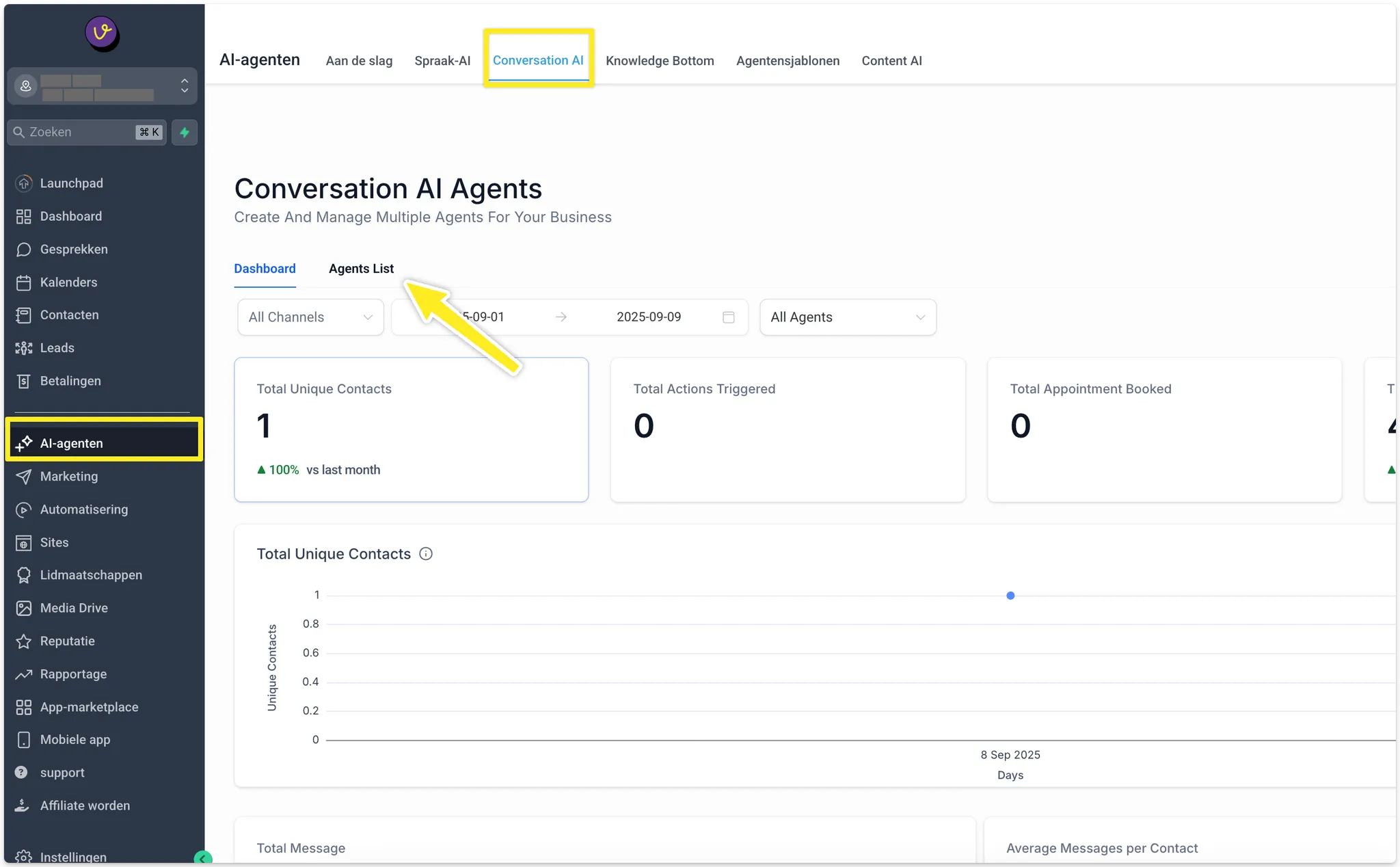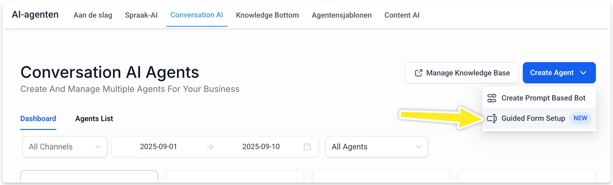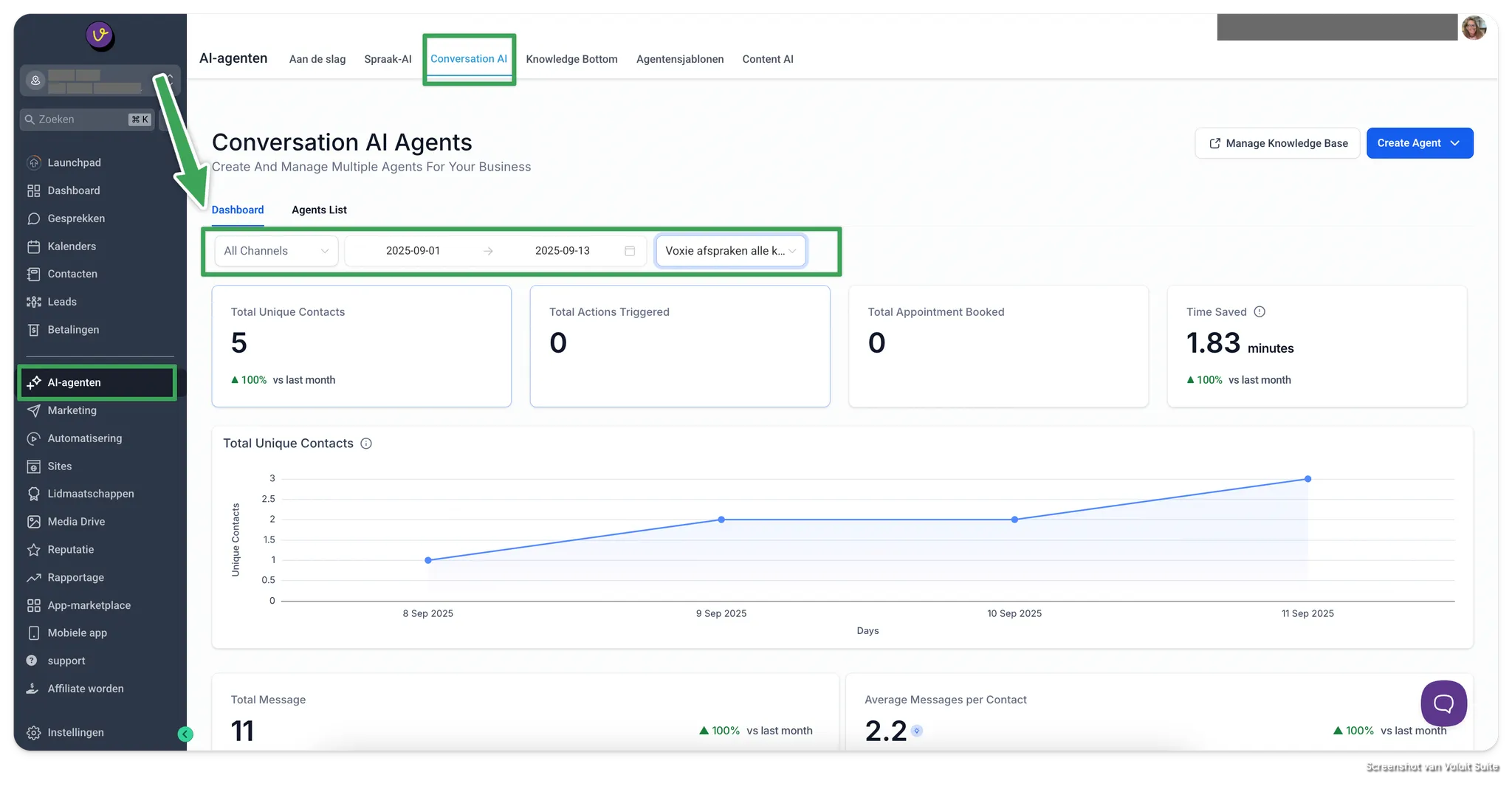 - Ga naar menu AI Agents → Conversatie AI → Dashboard.