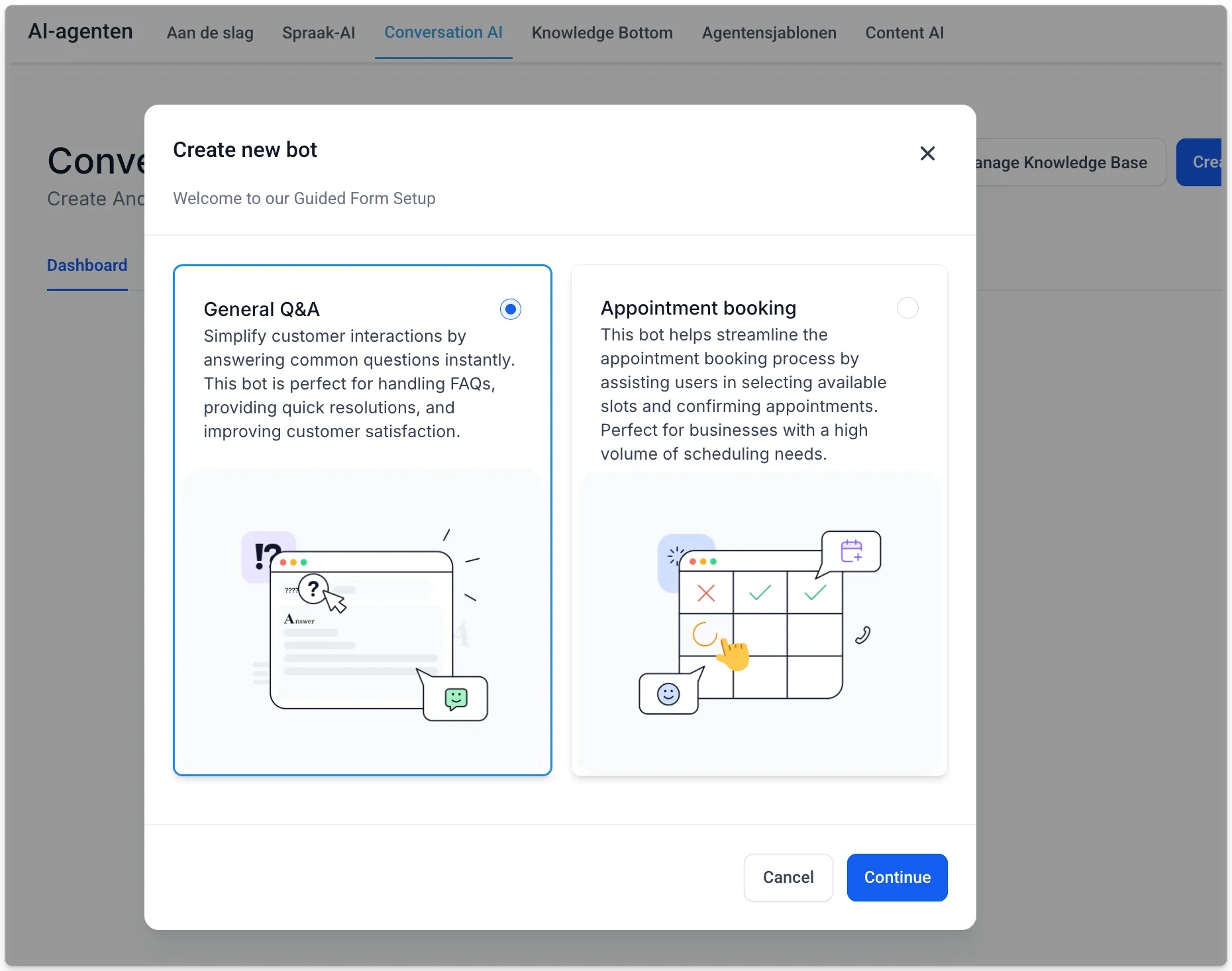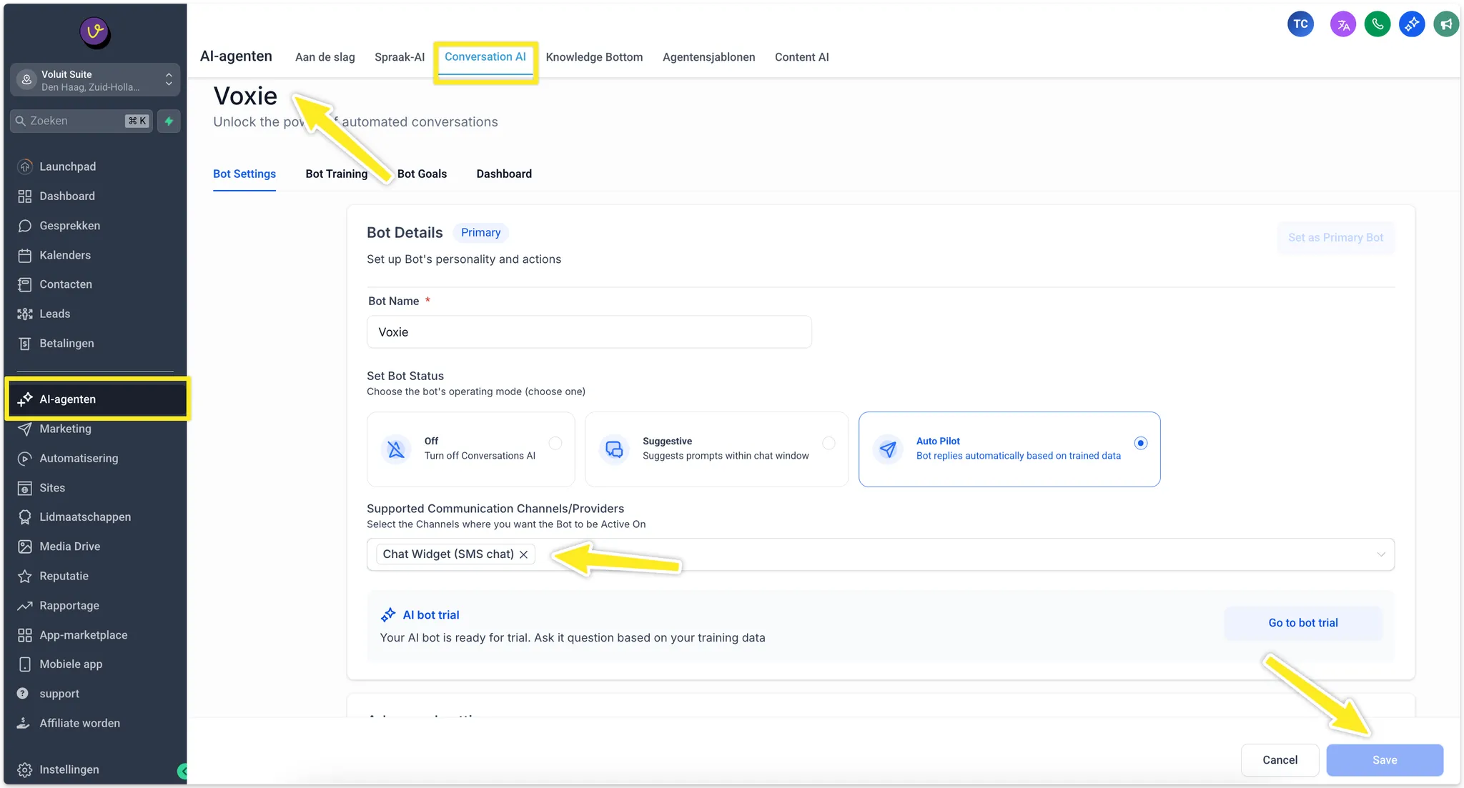 Je kunt selecteren via welke kanalen je wilt dat de bot communiceert door naar AI-Agenten > Conversatie AI te gaan en de kanalen toe te voegen in de instellingen van jouw AI-agent.