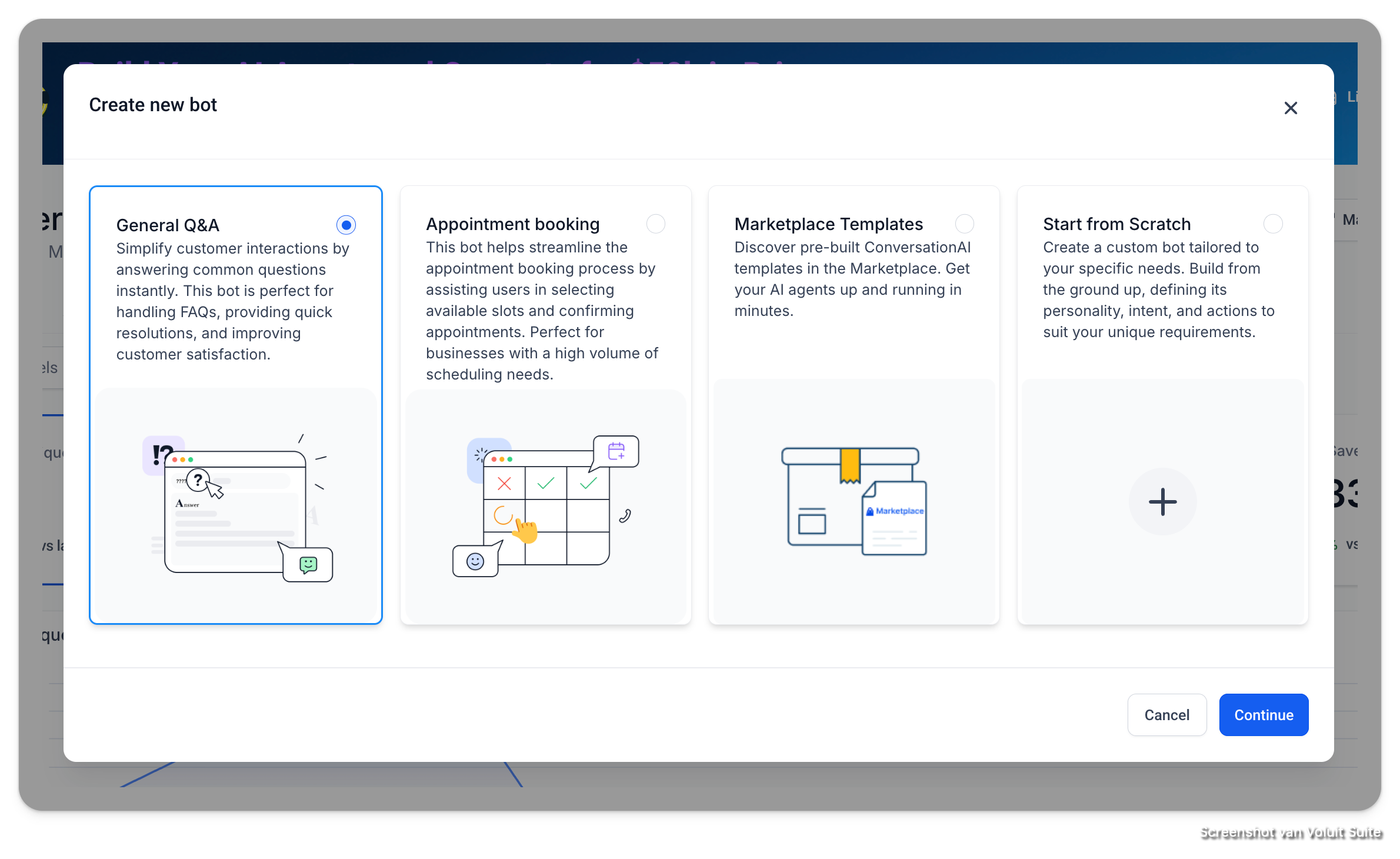 Je kunt altijd alles overschrijven wat is toegevoegd vanuit het gekozen sjabloon. Als je een sjabloon selecteert, vult Voluit Suite al wat voor je in om doelgerichte bot-prompts te creëren.
