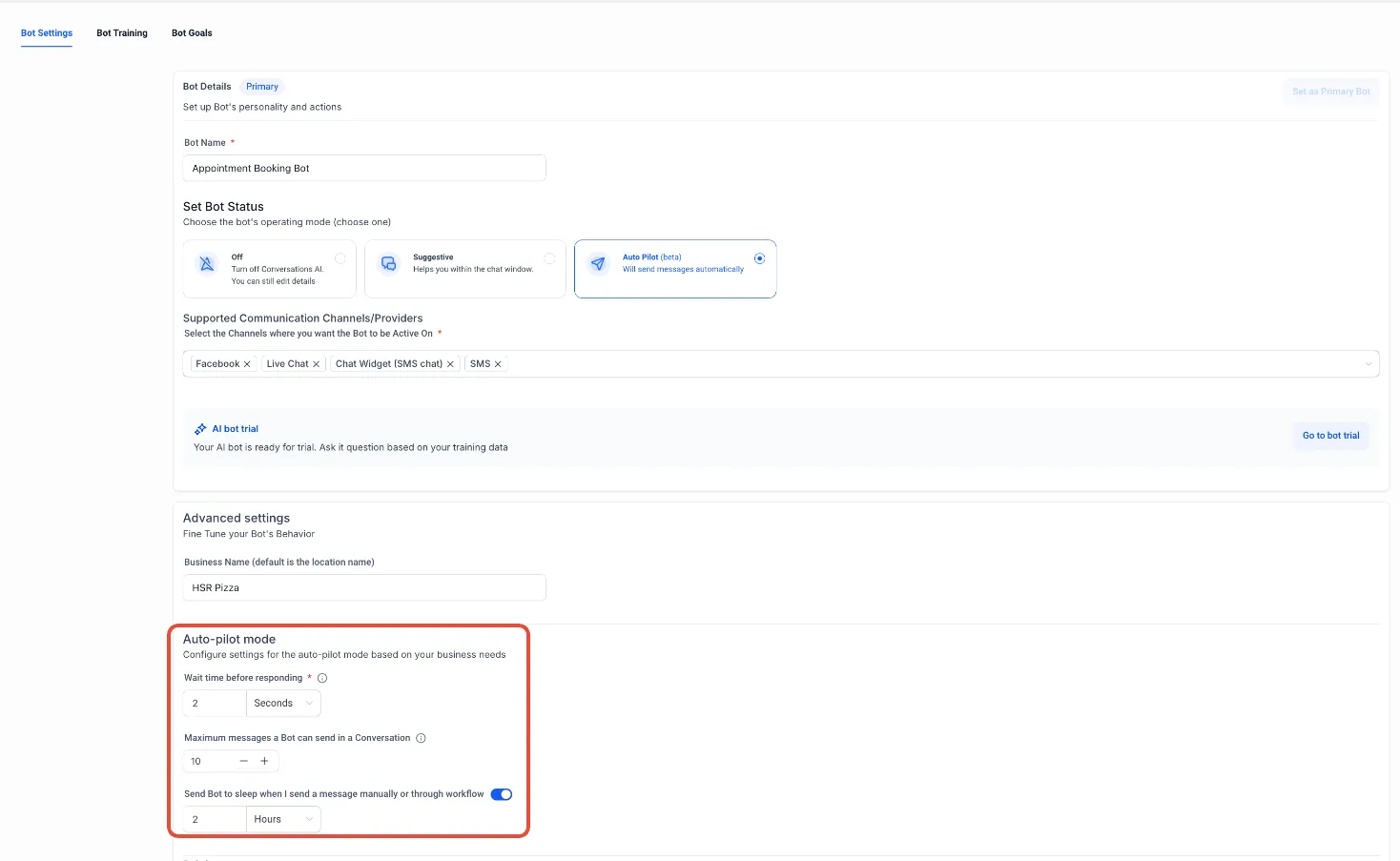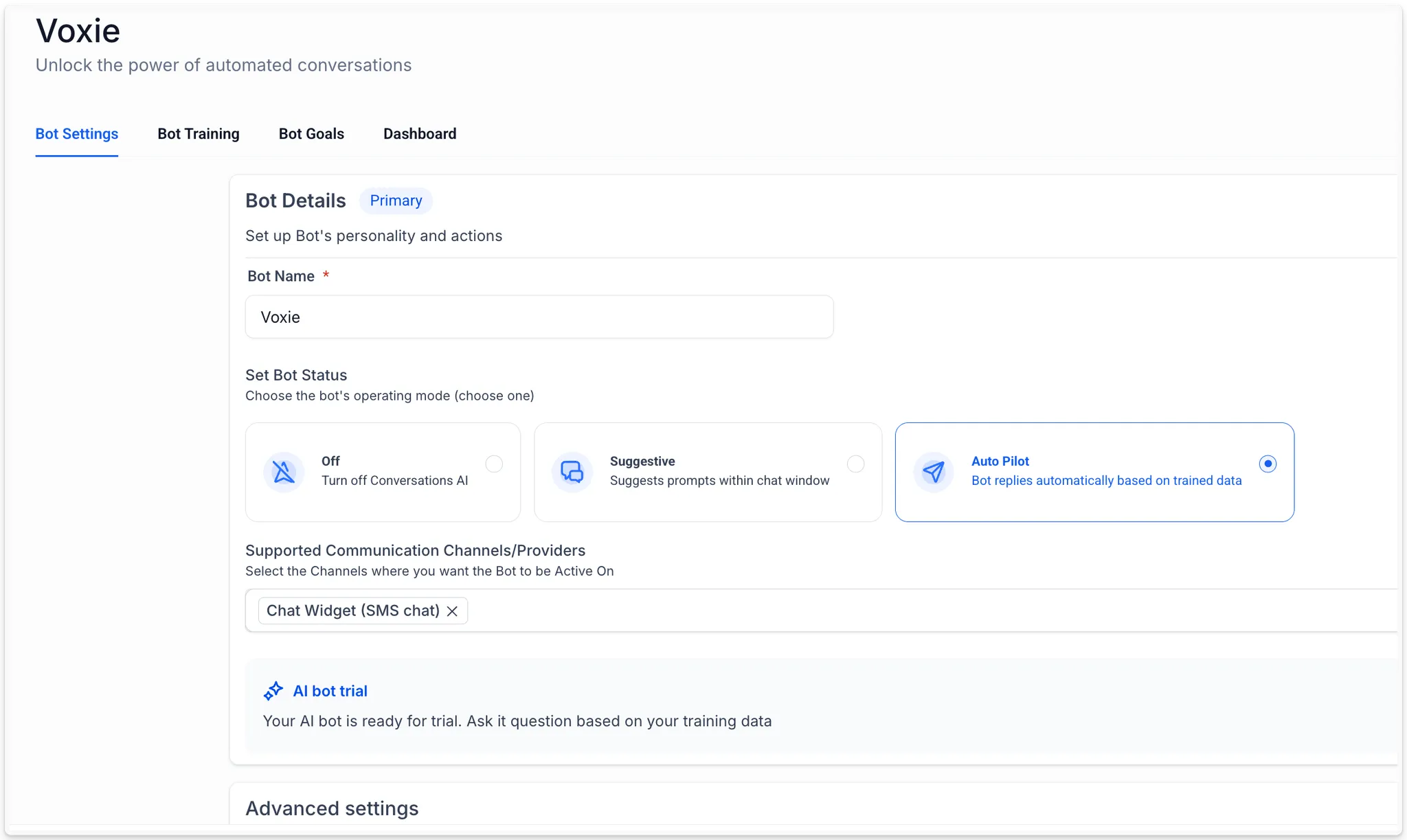 - Kanaal beschikbaarheid: Automatische Piloot is beschikbaar voor SMS, Webchat, livechat, Facebook en Instagram, en de kanalen kunnen worden geconfigureerd in het tabblad Bot Instellingen.