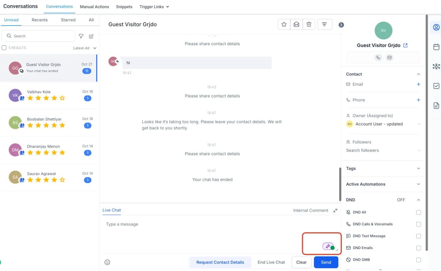 - Suggestief: De bot-antwoorden zijn beschikbaar in het berichtenvak in Gesprekken om ze handmatig te versturen zoals ze zijn of te bewerken voordat ze worden verzonden.