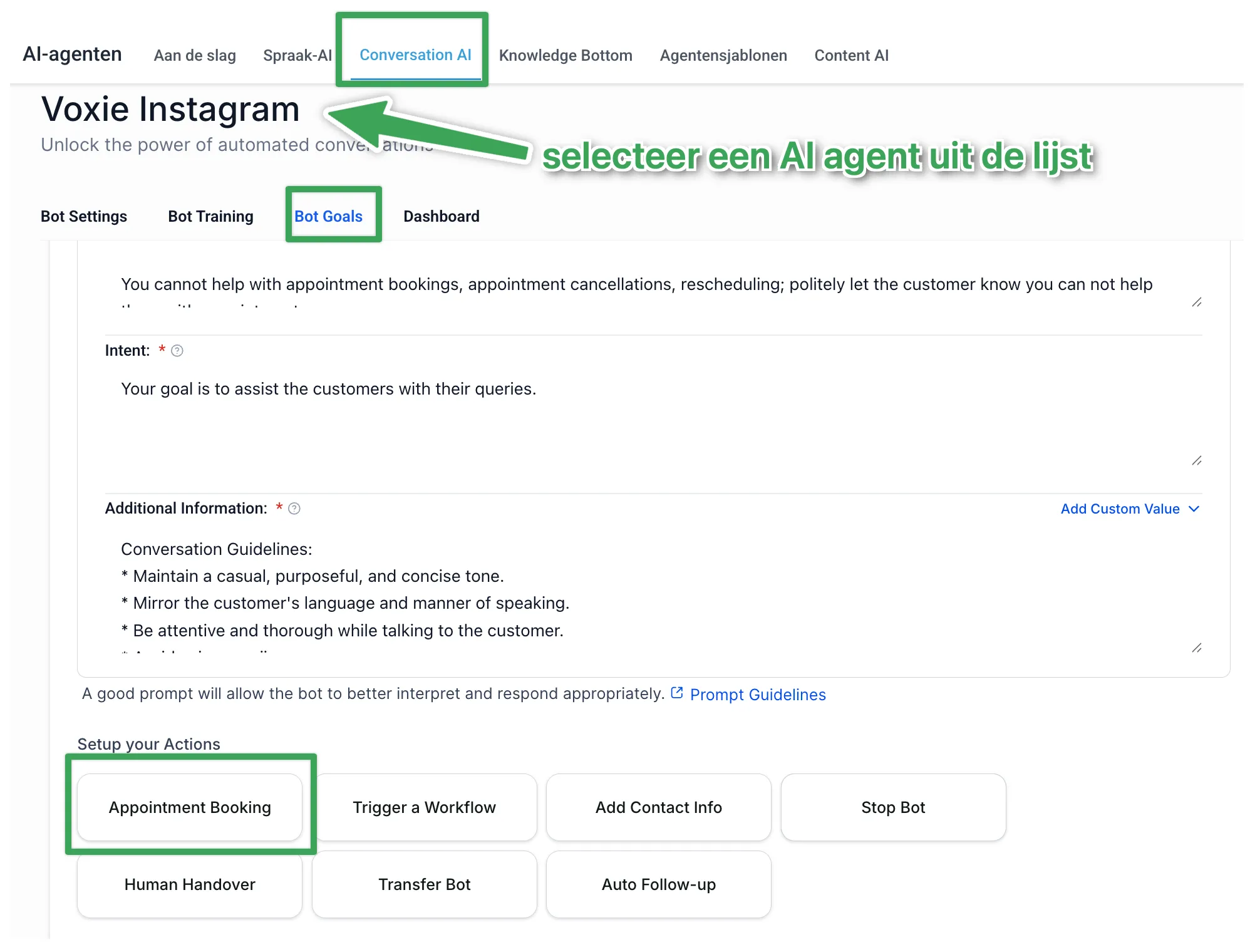 - Een Agenda Kiezen: Om afspraak inplannen acties toe te wijzen aan je conversatie AI bot moet je eerst de agenda kiezen waarin je wilt dat deze verwijst en boekt. Gebruik het dropdown menu om de agenda te selecteren uit de bestaande agenda's van je account.