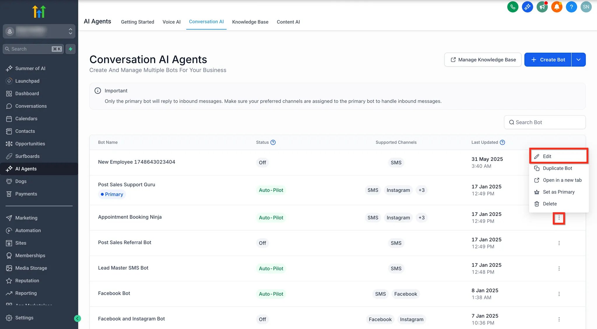 - Klik op de drie puntjes naast de naam van een bestaande bot en dan op Bewerken.