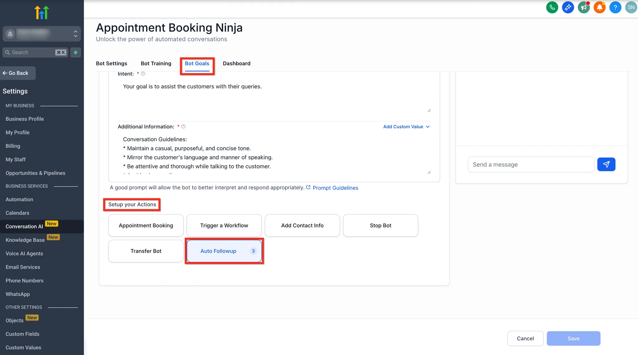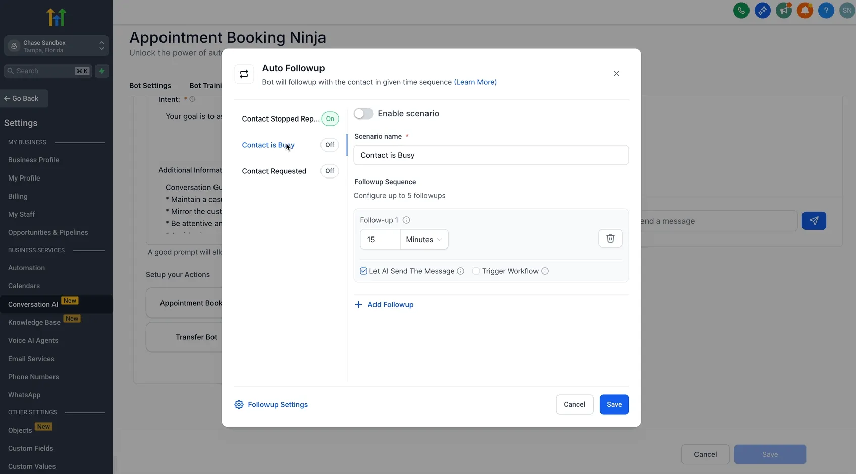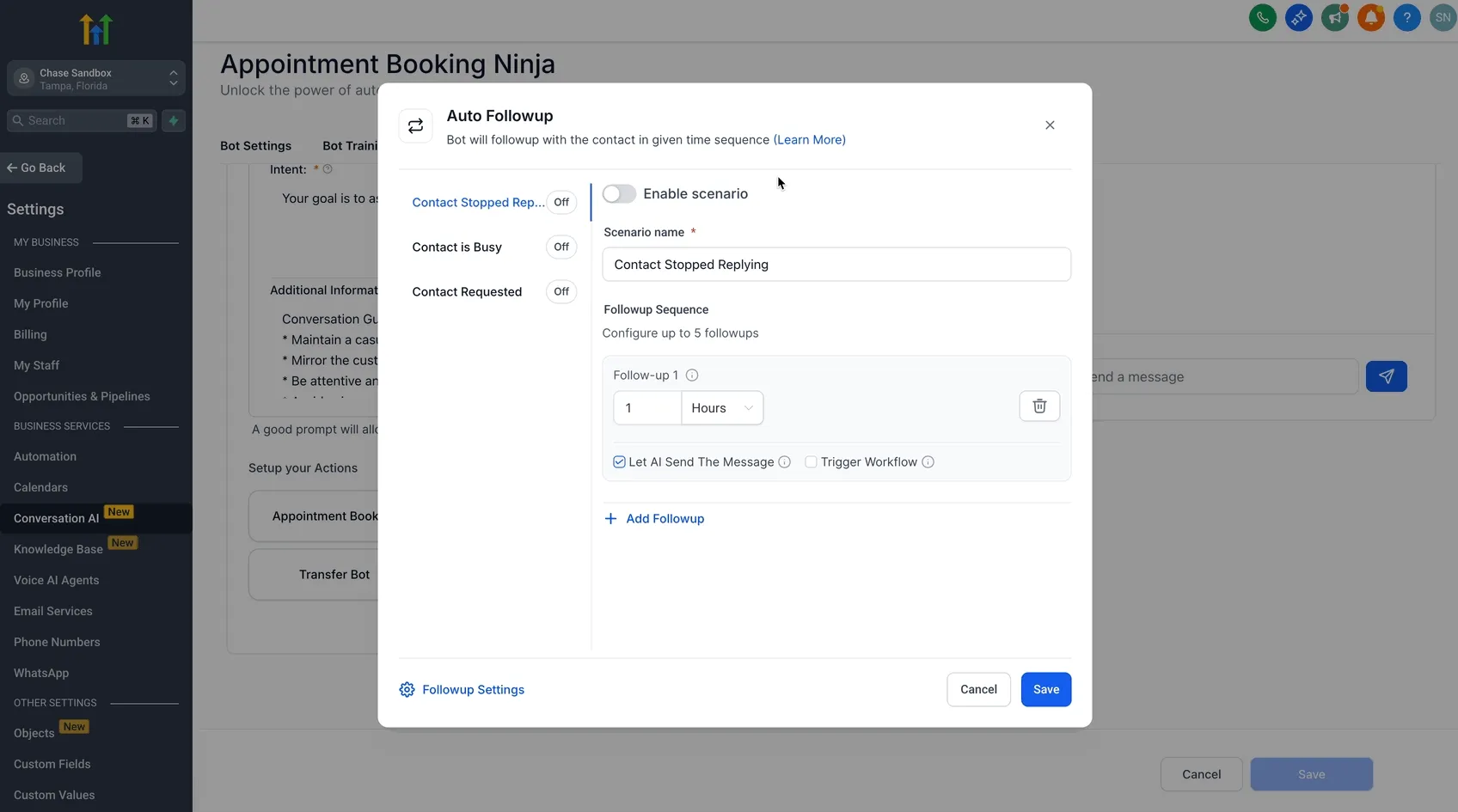 Een juiste instelling van Automatische Follow-Up zorgt ervoor dat je Conversation AI bot leads effectief opnieuw kan benaderen en in lijn met je zakelijke behoeften. Volg deze stappen om Automatische Follow-Up in te schakelen en te configureren: