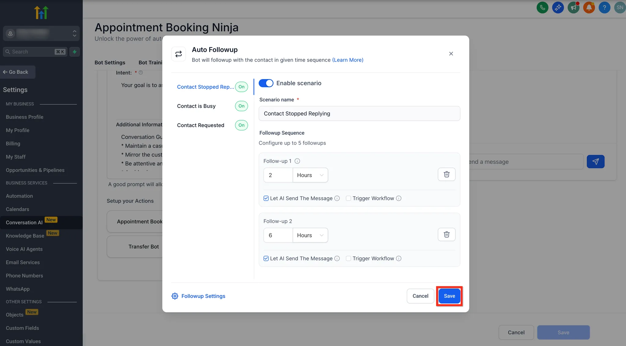 - Klik ten slotte op de algemene Opslaan knop om de Follow-Up Acties voor de bot te bevestigen en te activeren.