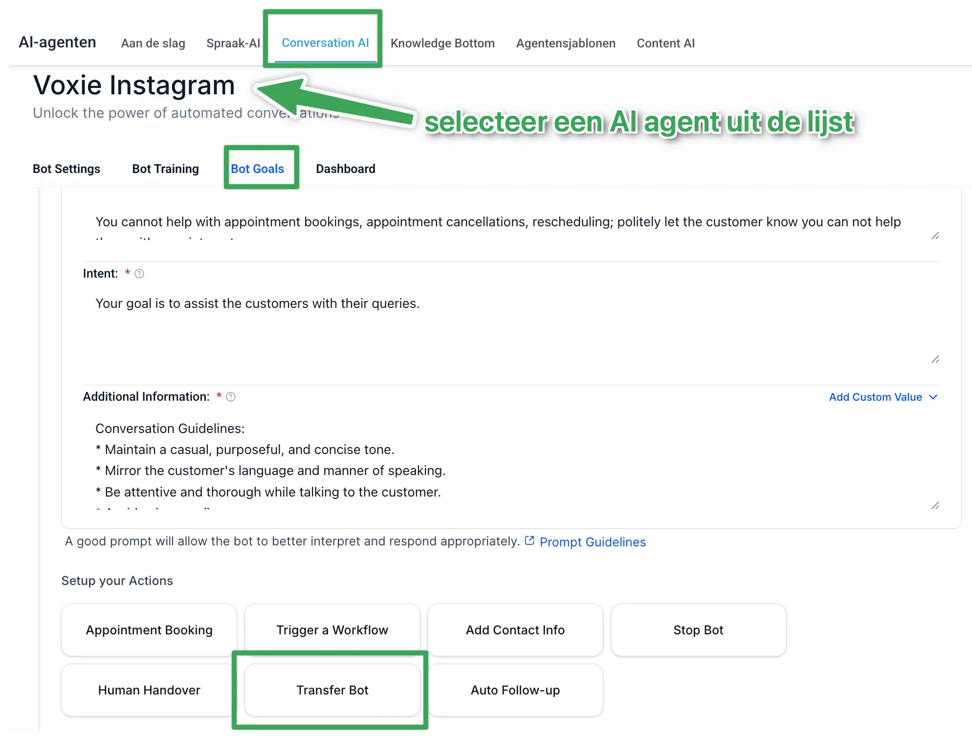 Volg deze stappen om een Bot Doorverwijzingsactie in je bot in te stellen: