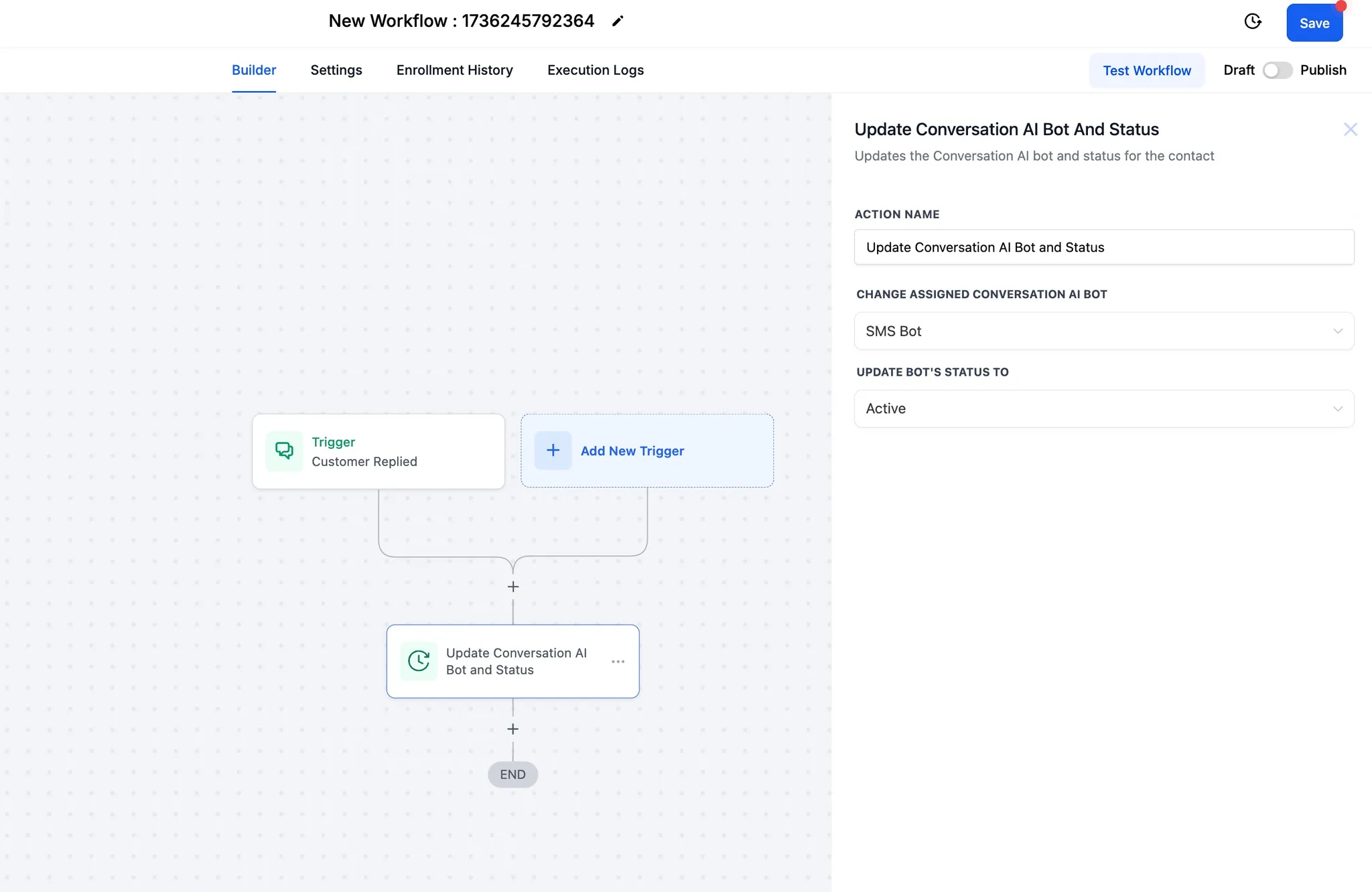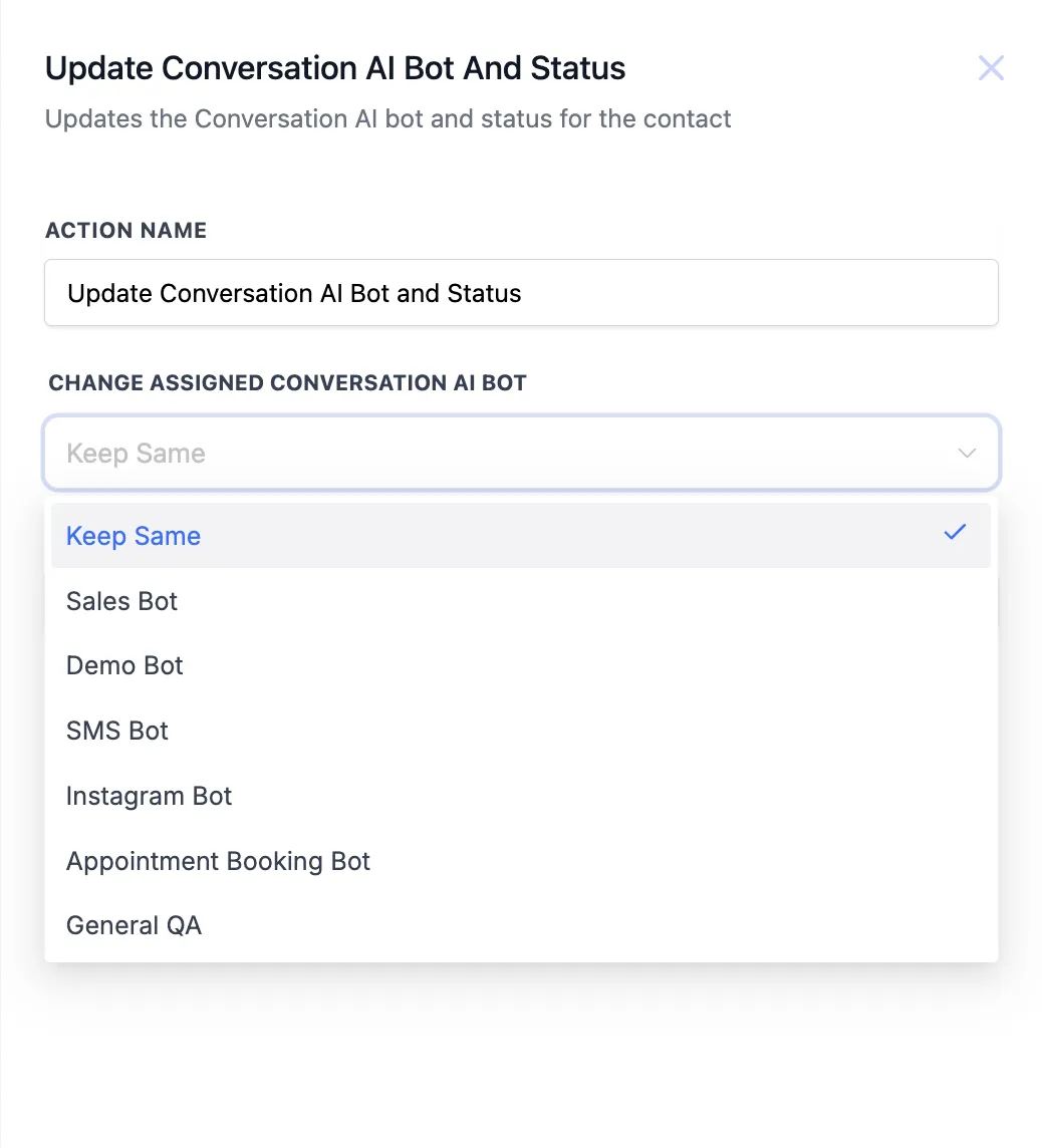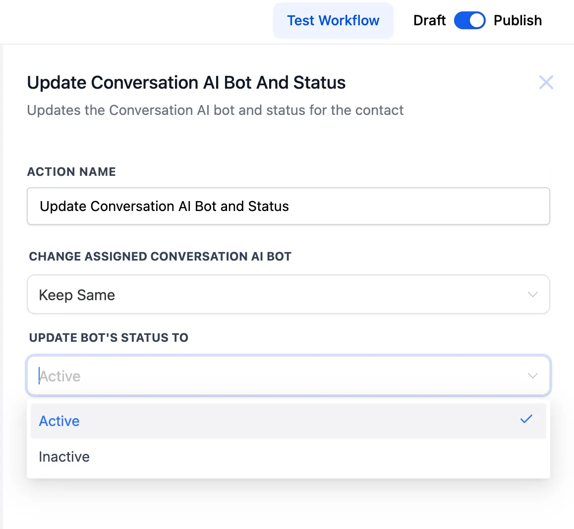 Met de workflow actie "Conversatie AI Bot en Status bijwerken" kun je een specifieke Conversatie AI bot toewijzen aan een contact en automatisch de status (Actief of Inactief) bijwerken. Deze actie stroomlijnt het beheer van Conversatie AI bots voor individuele contacten, waardoor interacties efficiënt verlopen op basis van hun klantreis, specifieke triggers of aangepaste criteria.
