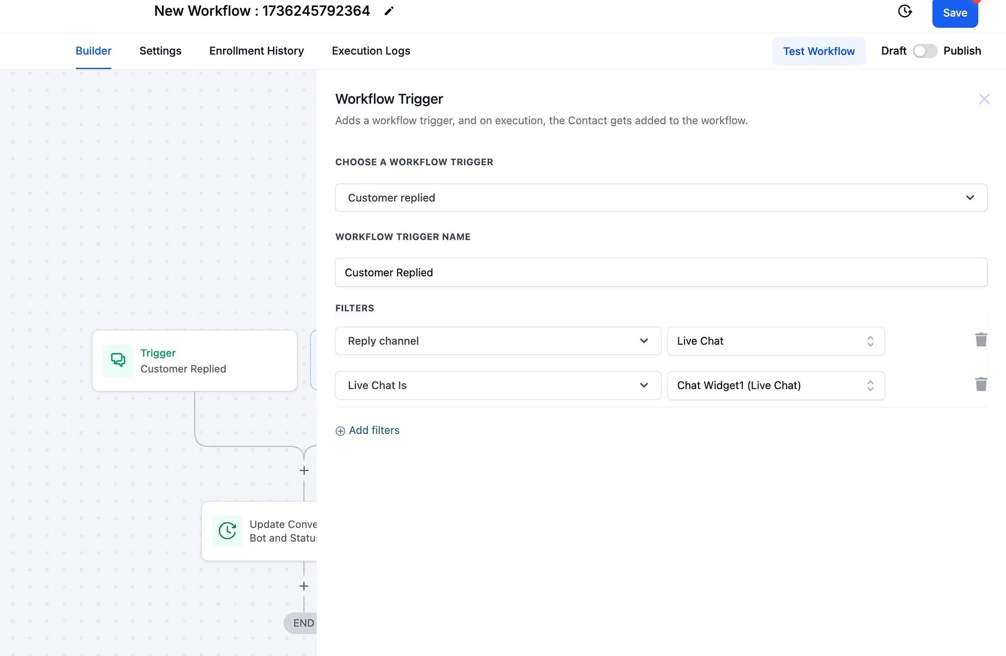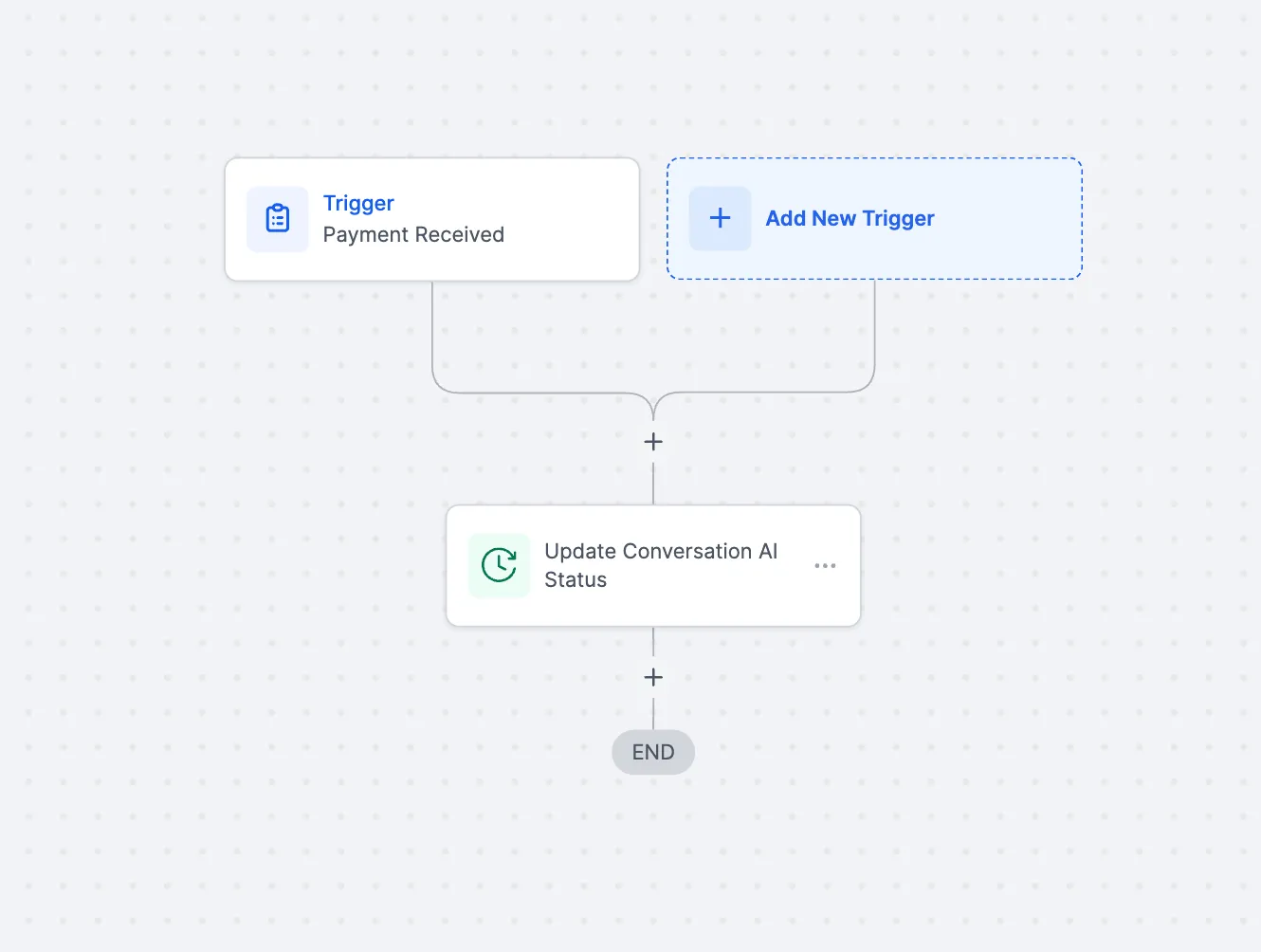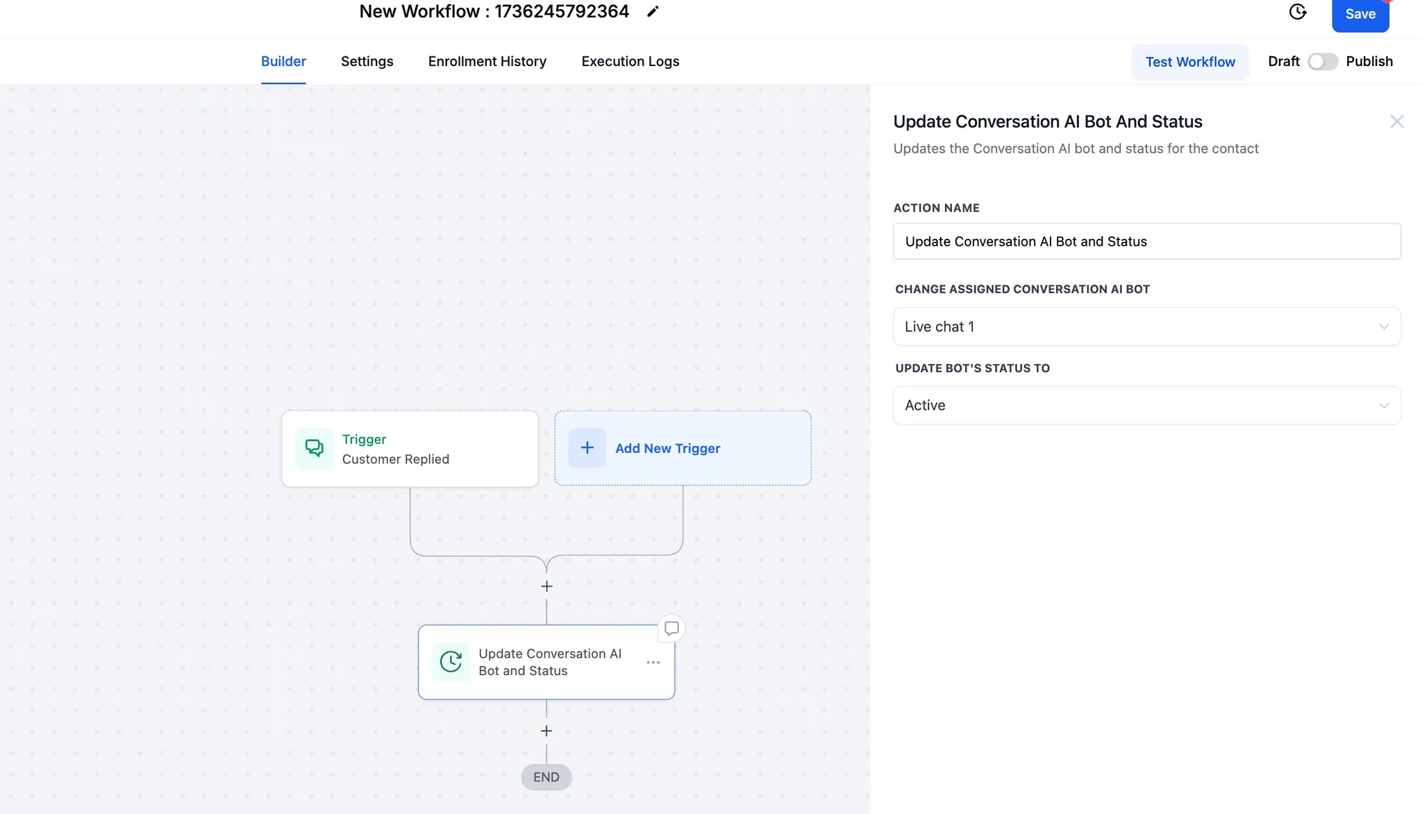 Met de workflow actie "Conversatie AI Bot en Status bijwerken" kun je een specifieke Conversatie AI bot toewijzen aan een contact en automatisch de status (Actief of Inactief) bijwerken. Deze actie stroomlijnt het beheer van Conversatie AI bots voor individuele contacten, waardoor interacties efficiënt verlopen op basis van hun klantreis, specifieke triggers of aangepaste criteria.