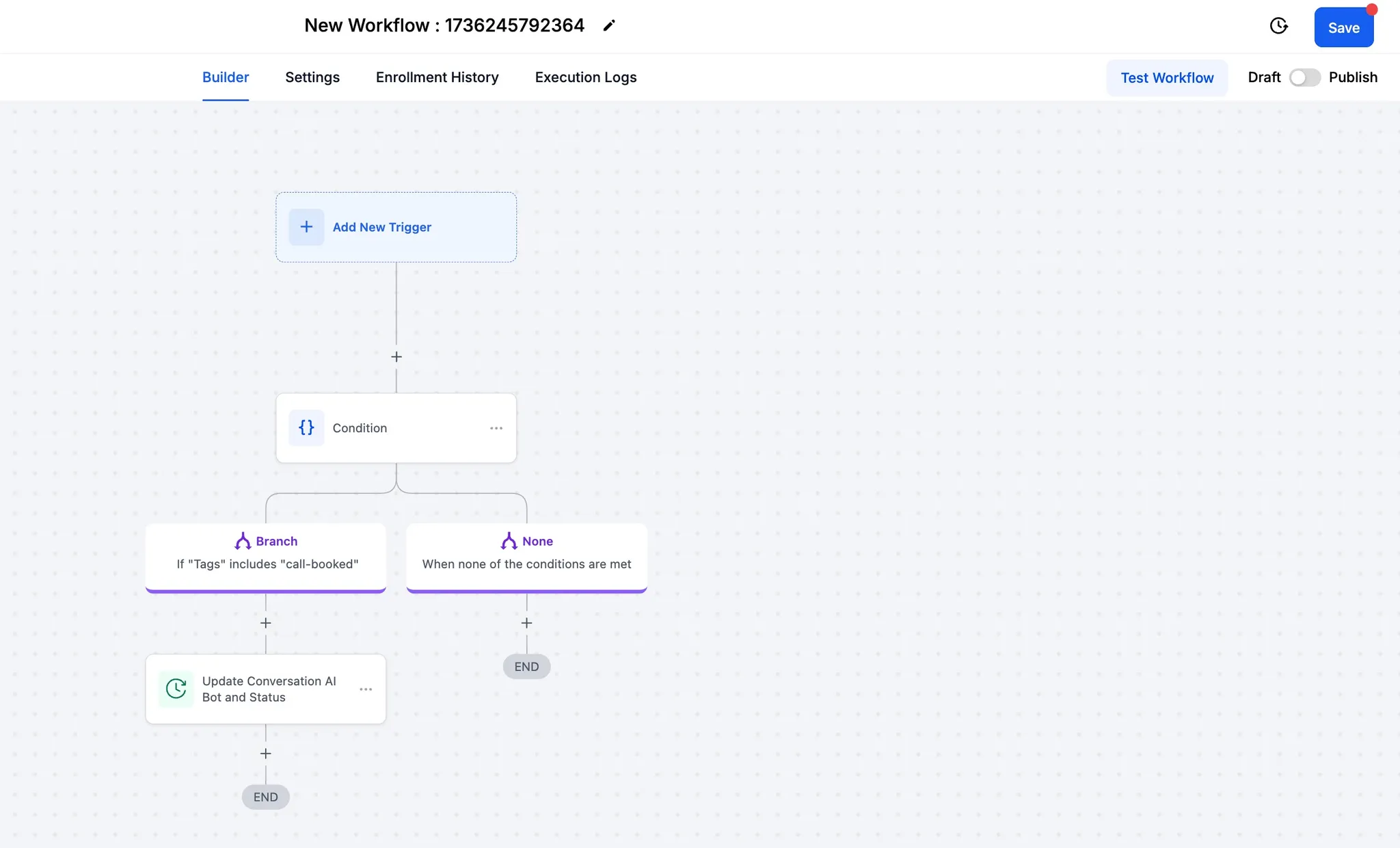 - Selecteer de trigger, bijv. Contact toegevoegd met Tag: Gesprek Geboekt.