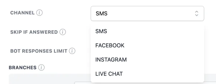 Kies één kanaal uit SMS, LIVE CHAT, FB en IG waar de bot het bericht naar het contact stuurt.