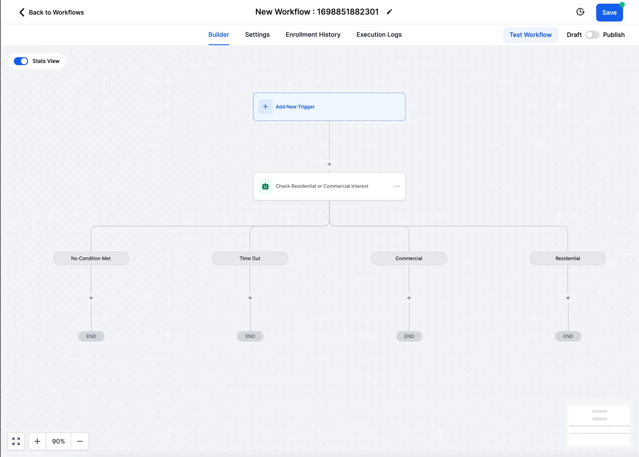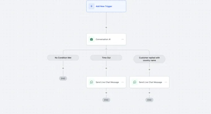 - Zodra het contact binnen de periode reageert, controleert de bot welke voorwaarde is voldaan vanuit het antwoord van het contact en als er geen voorwaarde is voldaan, gaat het contact naar de "Geen voorwaarde voldaan" vertakking (gebruik de "GOTO" acties om de vragen te stellen)