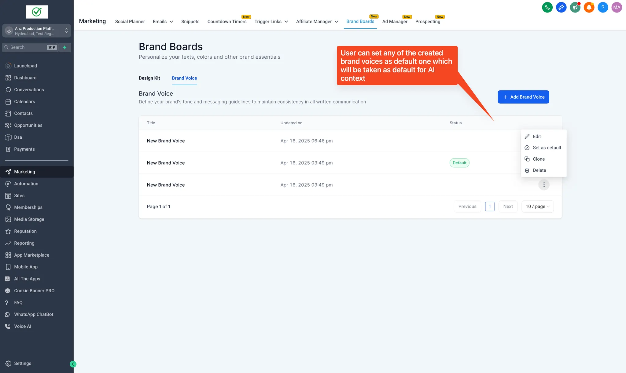 Klik op de drie puntjes om een Brand Voice als je standaard Brand Voice in te stellen