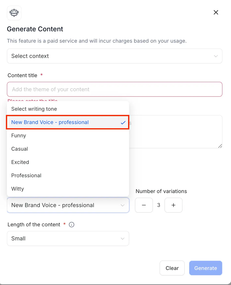 Verbeterde AI-prestaties: Verbetert de nauwkeurigheid en relevantie van door AI gegenereerde content door duidelijke communicatierichtlijnen te bieden. Op dit moment kun je Brand Voice als toon selecteren in de Content AI-modal