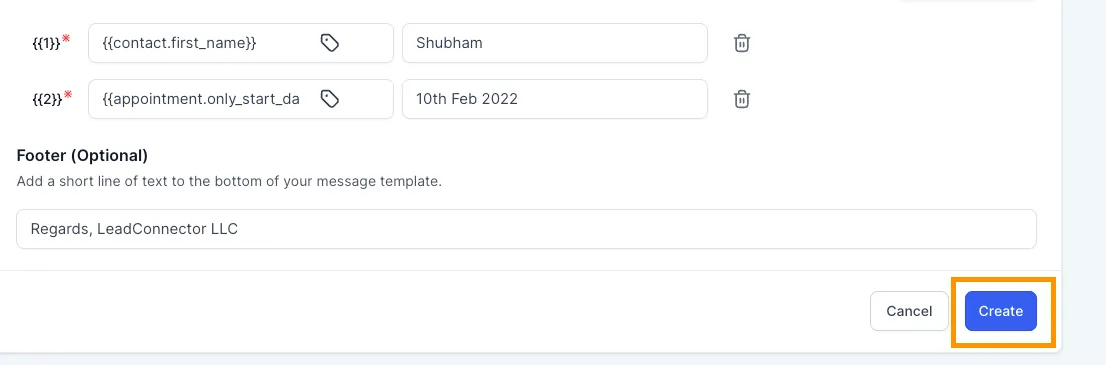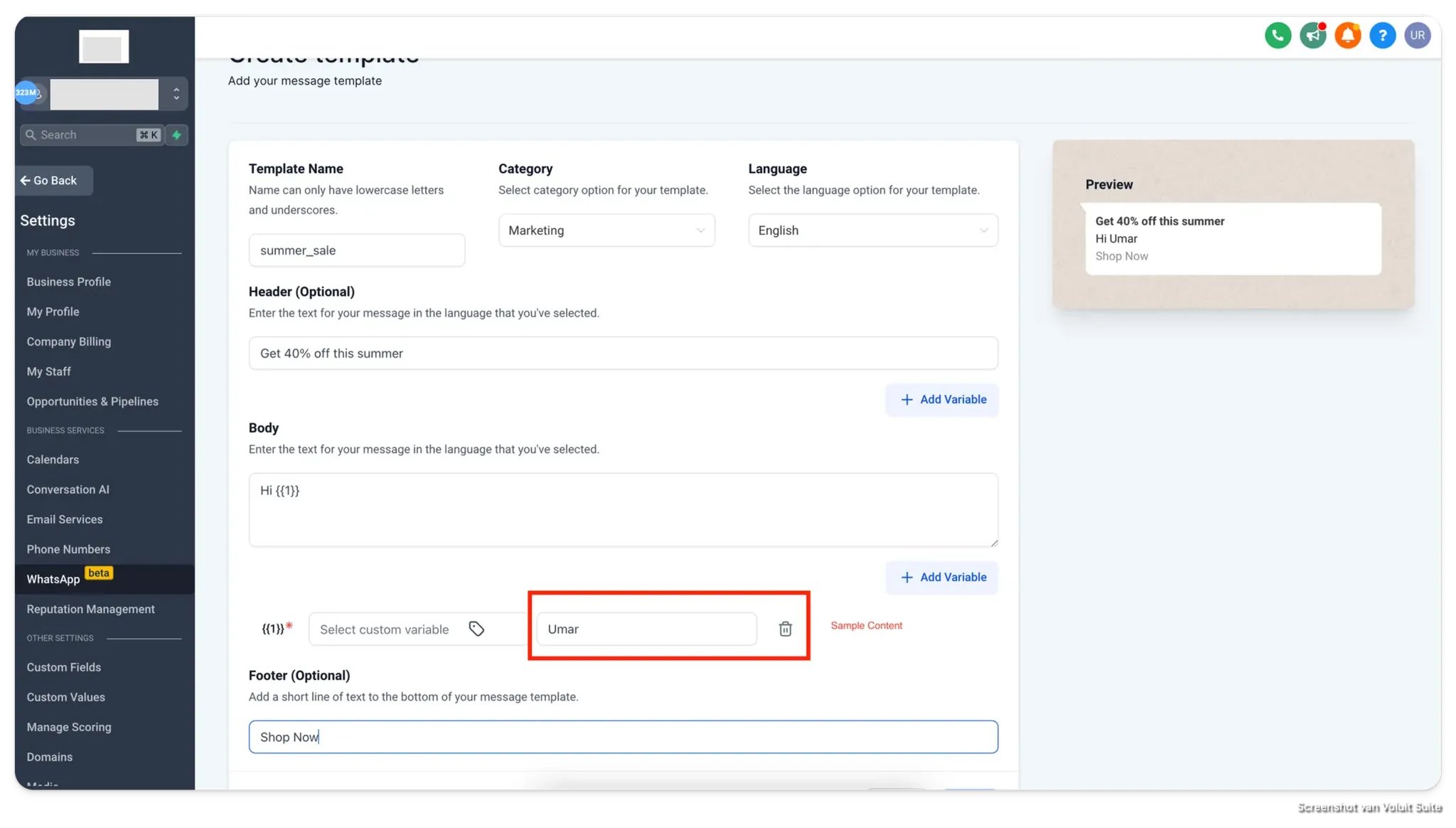 - Voeg voorbeeldinhoud toe voor variabelen tijdens template-aanmaak om Meta-goedkeuring te versoepelen.