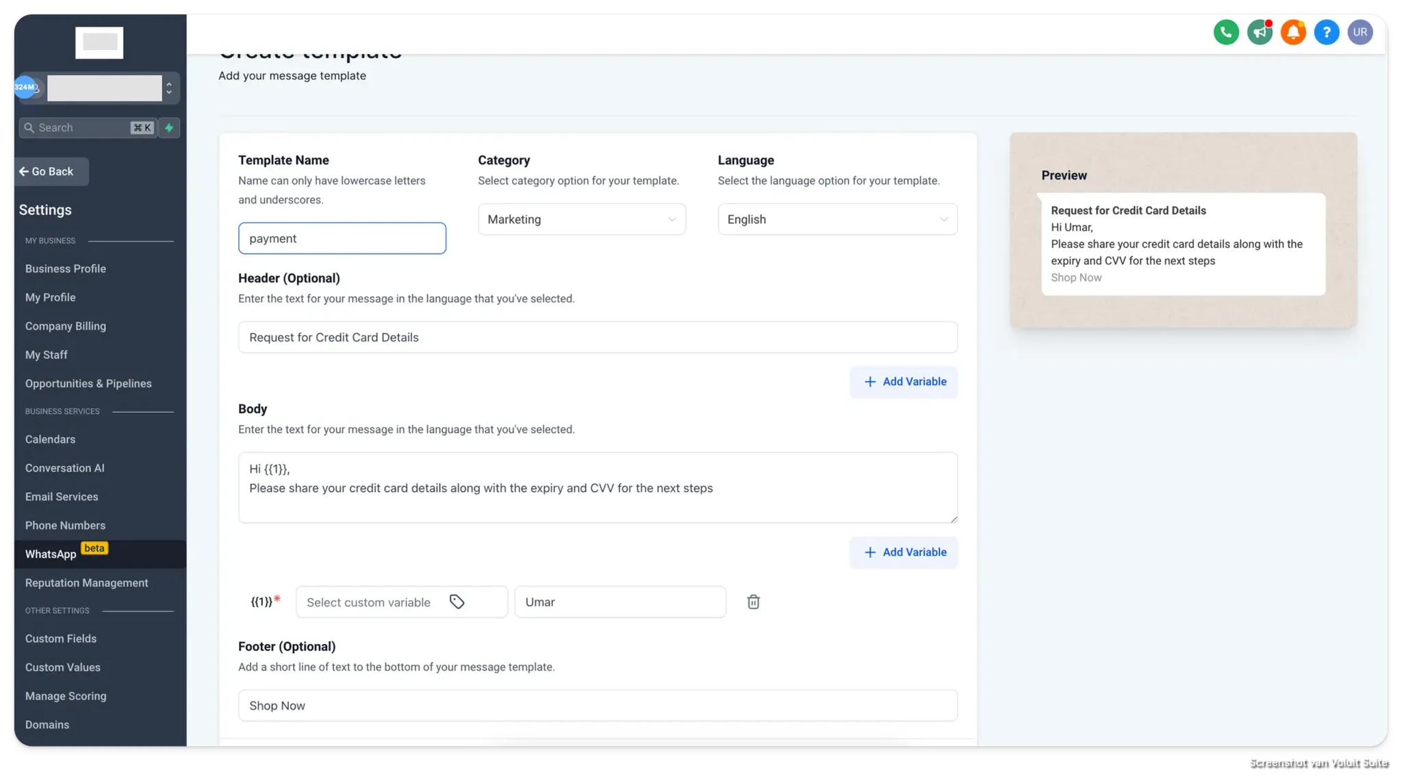 - Bericht - De tekst die naar de klant wordt gestuurd. Je kunt meerdere aangepaste waardes toevoegen tijdens het maken van de template door op Variabele toevoegen te klikken.