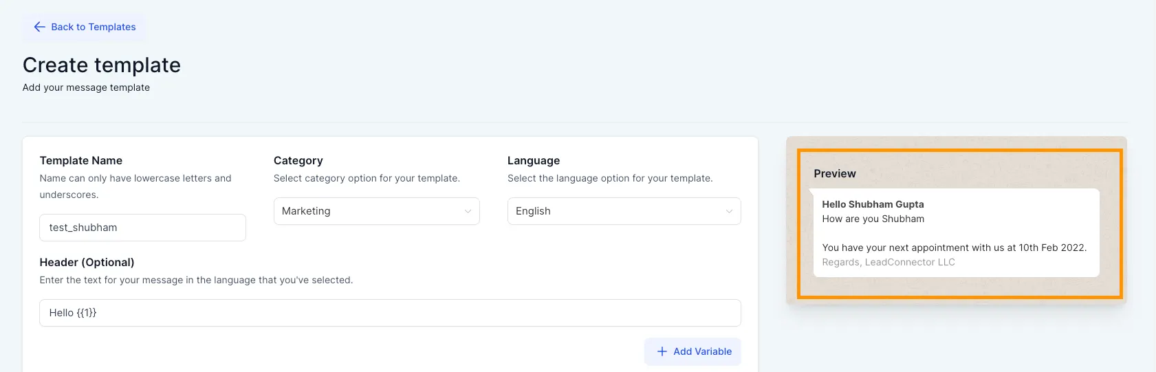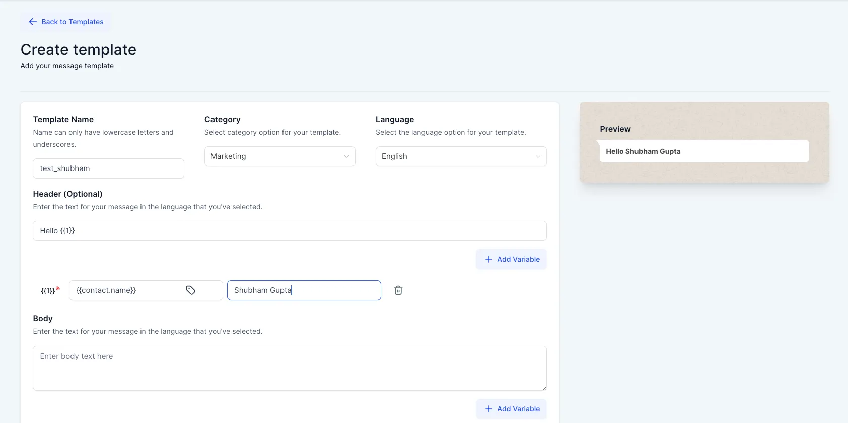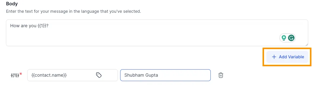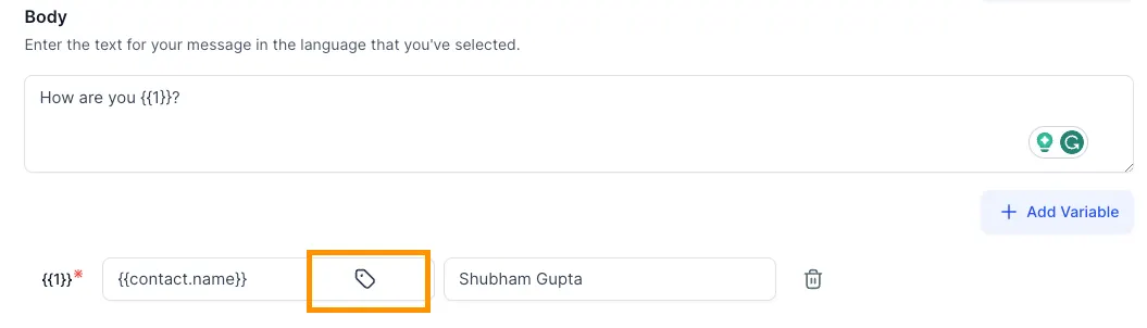 - Klik op het tag-icoon en selecteer de aangepaste variabele (in dit geval is het de contactnaam) en voeg een voorbeeldtekst toe (Shubham Gupta in dit voorbeeld).