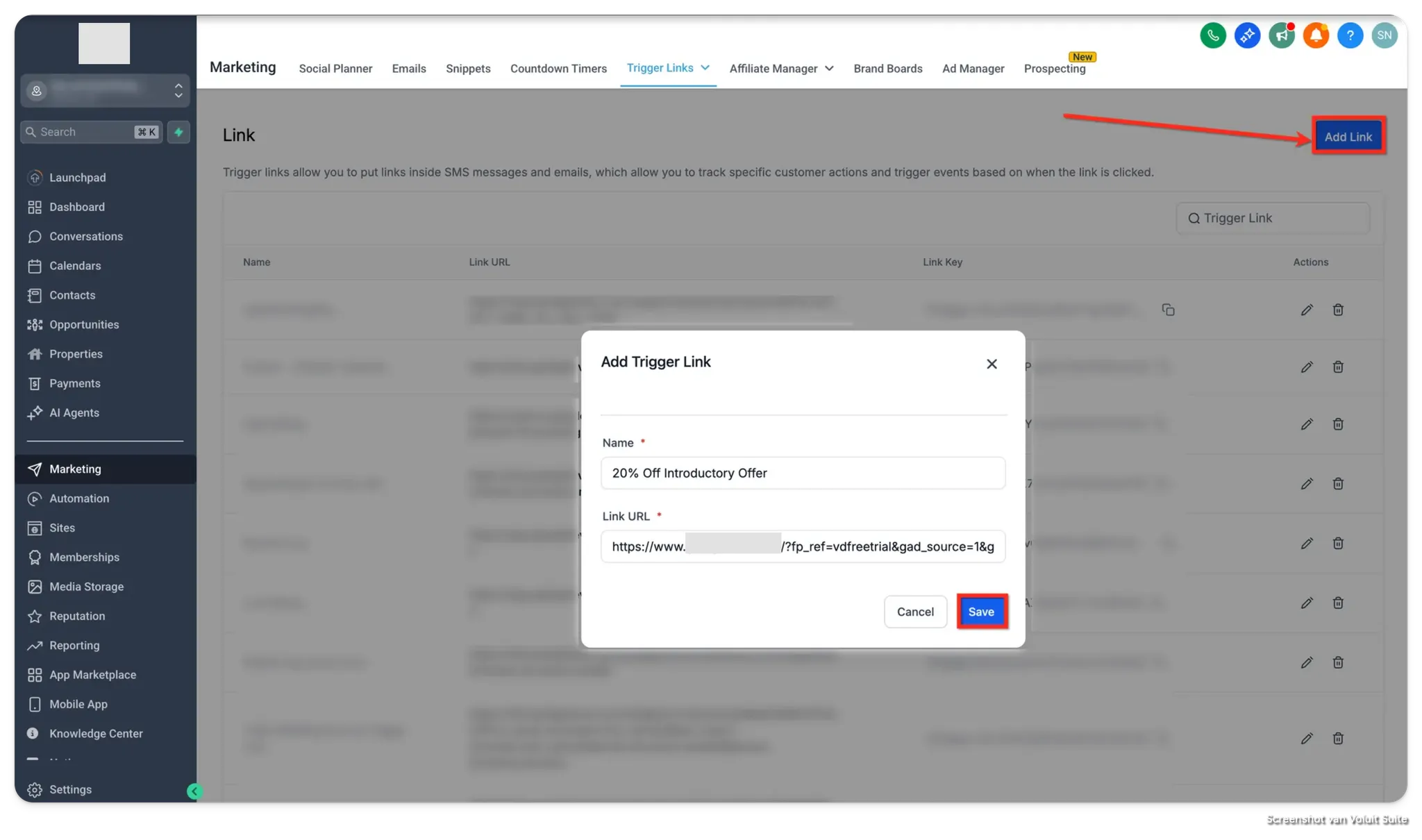 - Klik op Link toevoegen, geef het een naam (bijv. 20% Korting Introductieaanbieding), en plak de bestemmings-URL (bijv. landingspagina met formulier).