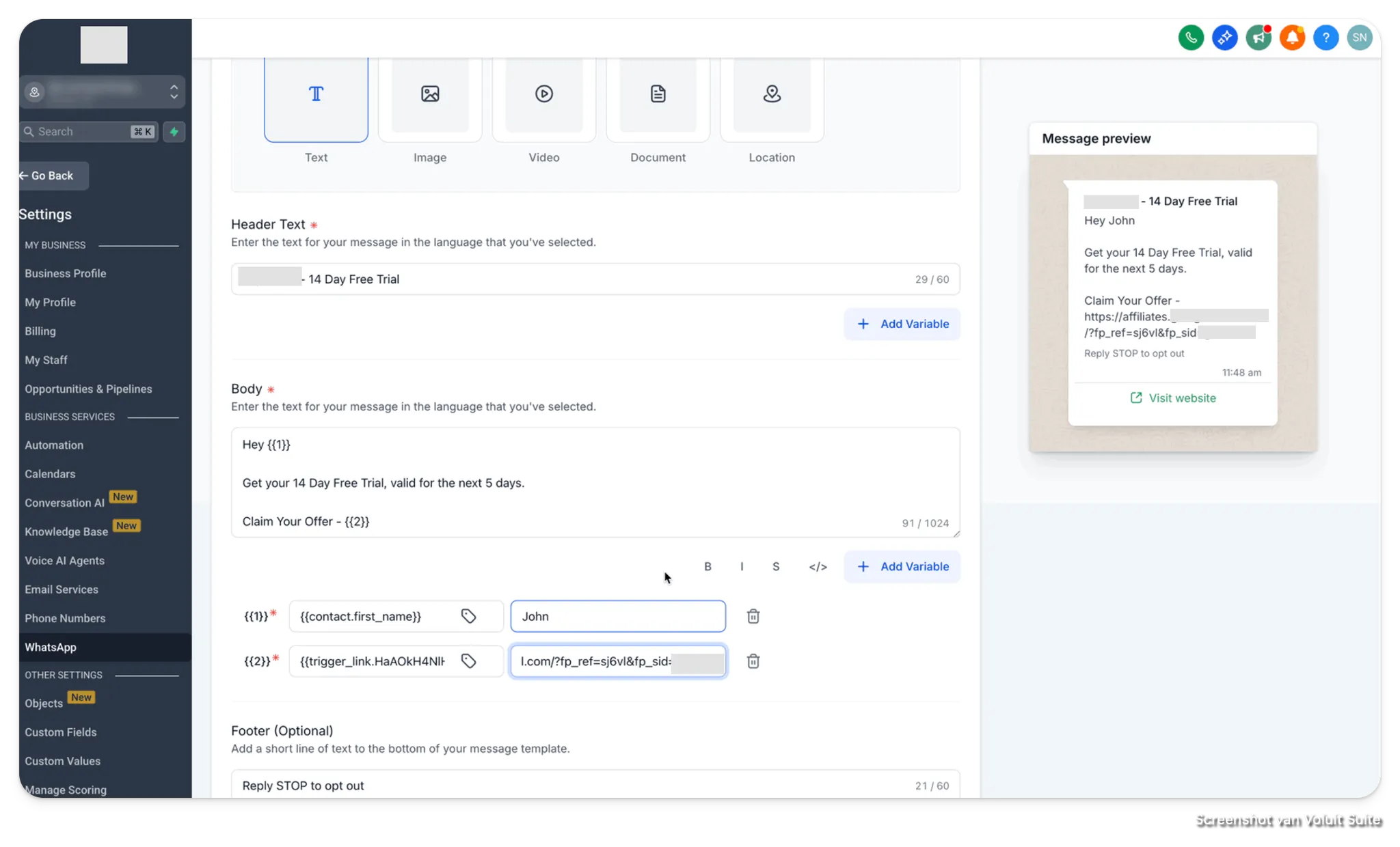 - (Optioneel) Voeg een Footer toe (bijv. "Antwoord STOP om je af te melden").