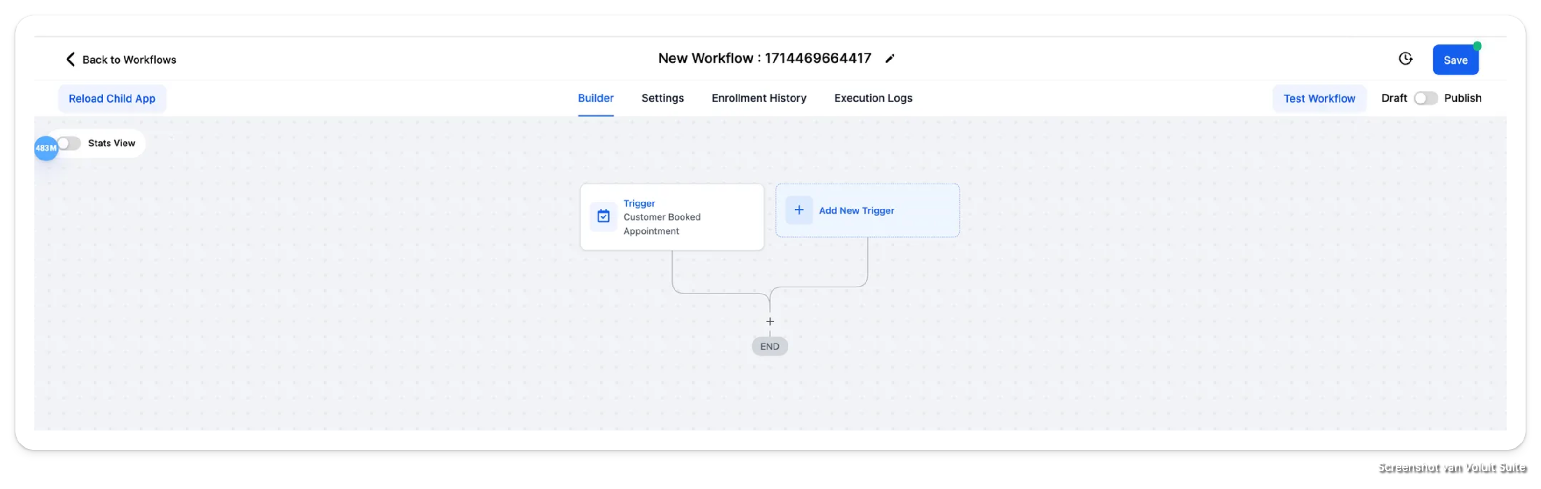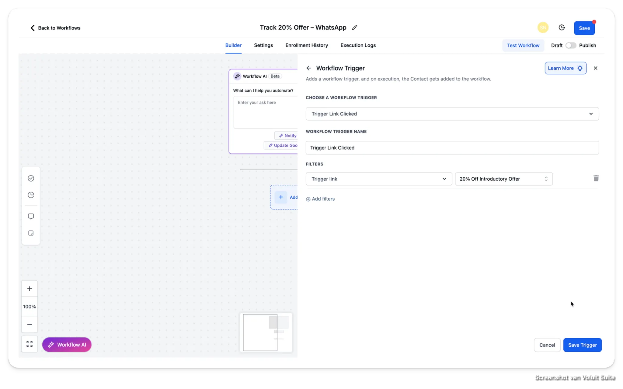 - Ga naar Automatisering → Workflows → Maak vanaf begin (noem het bijv. Track 20% Aanbieding – WhatsApp).