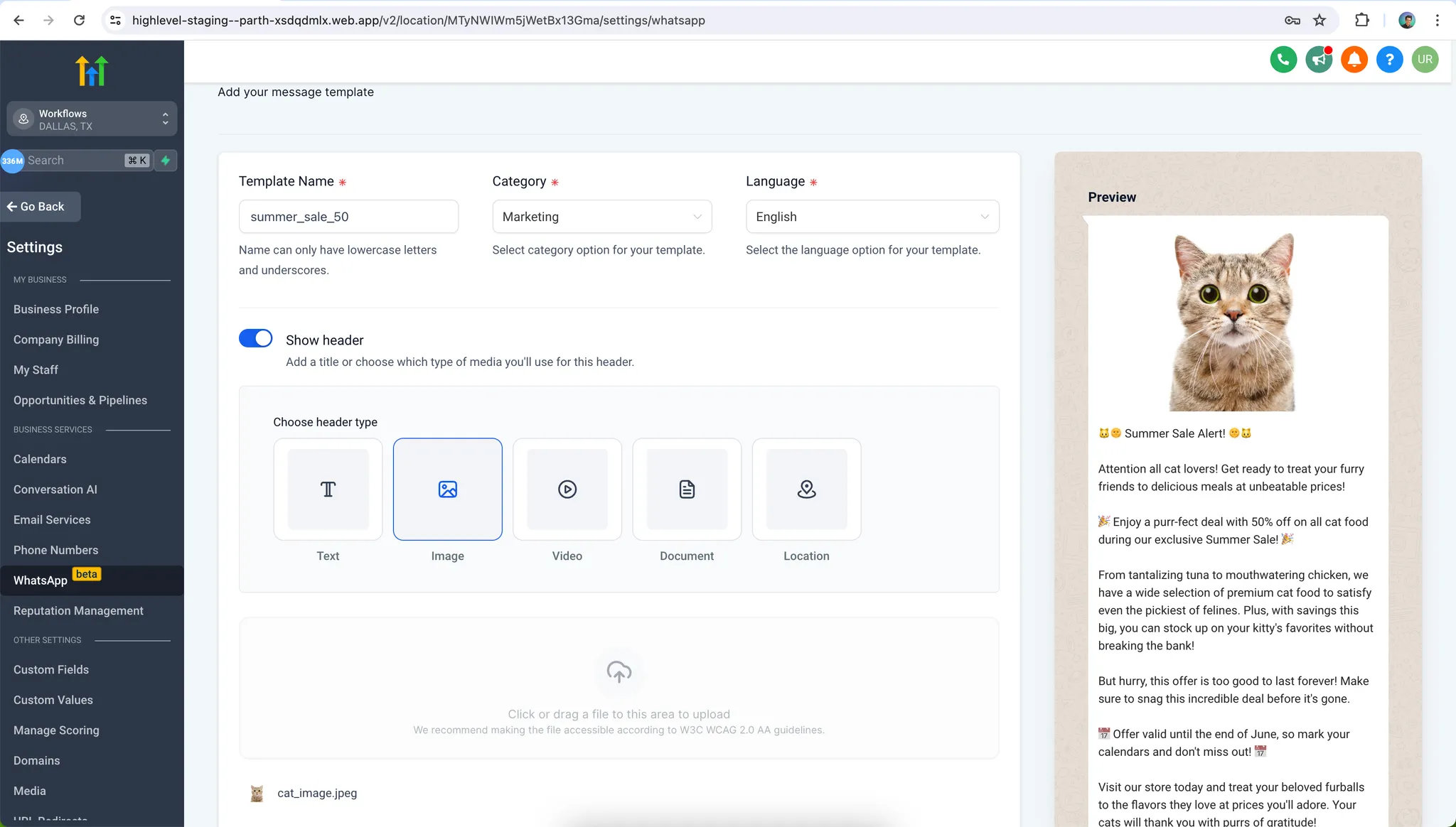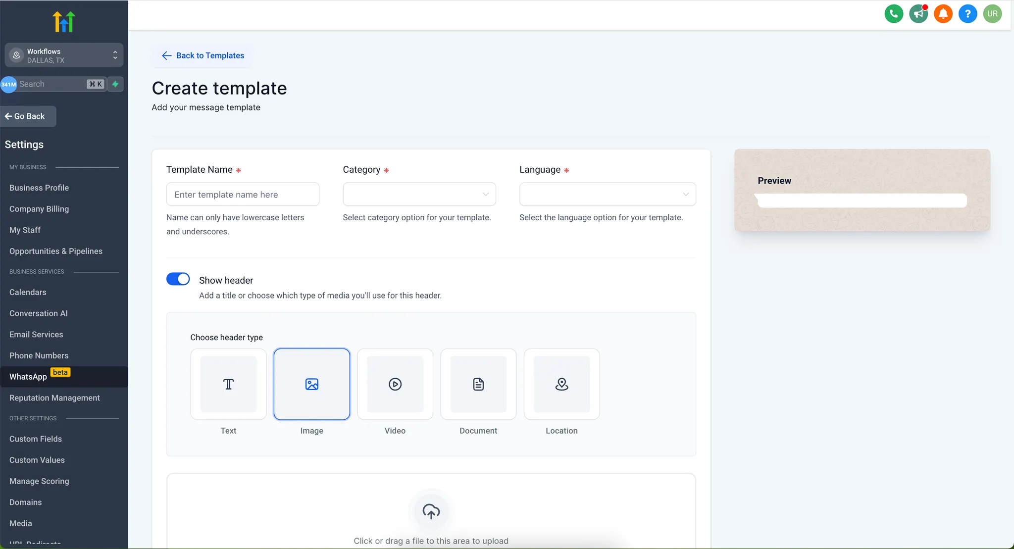 Stap 2: Voeg template naam, categorie en taal toe > Toon header en klik op Media > Upload Media