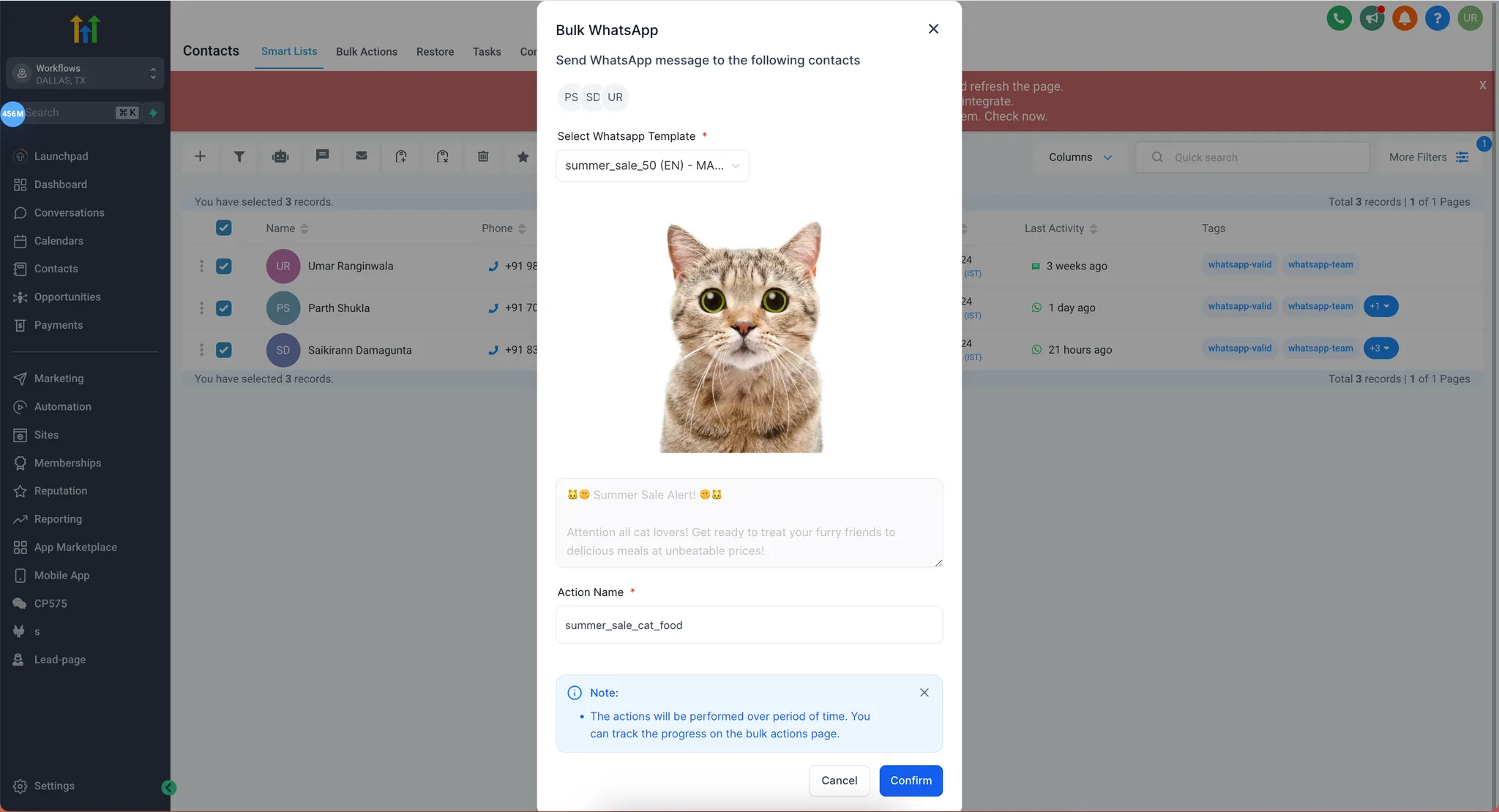 Stap 2: Selecteer alle Contacten > Klik op het WhatsApp icoon > Selecteer template > Voeg actienaam toe