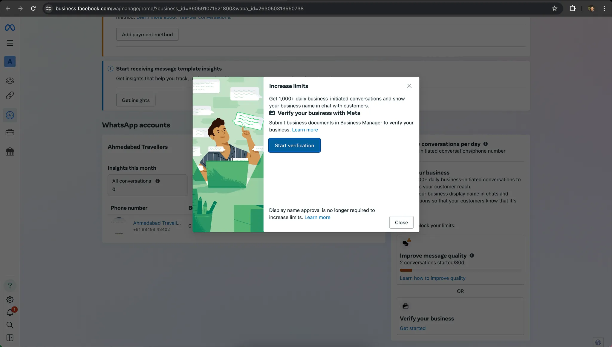 Als je wordt afgewezen voor bedrijfs- of identiteitsverificatie, zorg er dan voor dat je berichten van hoge kwaliteit verstuurt. Meta zal regelmatig je berichtactiviteit en kwaliteit opnieuw evalueren en op basis van deze analyse kan een verhoging worden goedgekeurd.