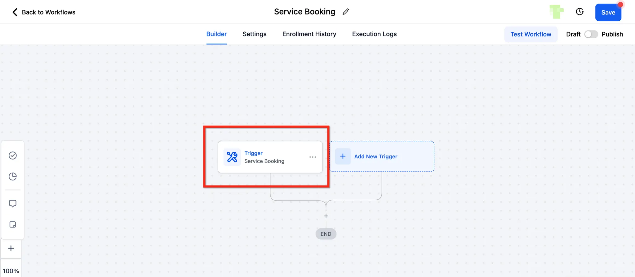 - Nieuwe workflows → De Service Booking trigger is niet beschikbaar voor selectie.