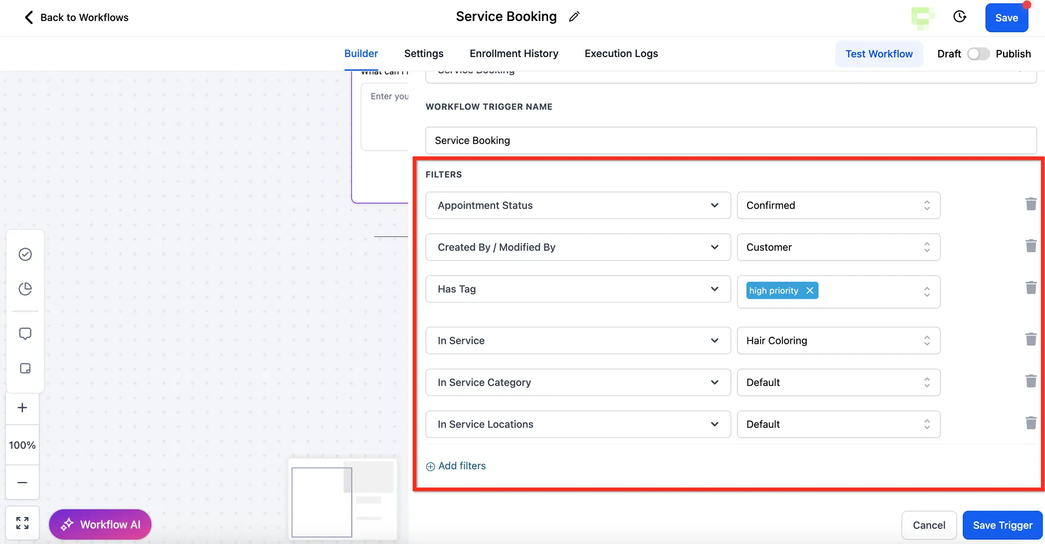 Met de Service Booking trigger kun je workflows automatiseren wanneer een Service Booking (die meerdere services/afspraken kan bevatten) wordt aangemaakt of bijgewerkt. In tegenstelling tot triggers op afspraakniveau (die werken voor individuele kalenderafspraken), werkt deze trigger op het niveau van de hoofdboeking. Als een klant dus meerdere services tegelijk boekt (bijvoorbeeld een knipbeurt, gezichtsbehandeling en massage in één keer), wordt de workflow slechts één keer geactiveerd voor de hele boeking — niet drie keer. Dit helpt je om dubbele acties te voorkomen terwijl je nog steeds toegang hebt tot alle servicedetails op één plek.