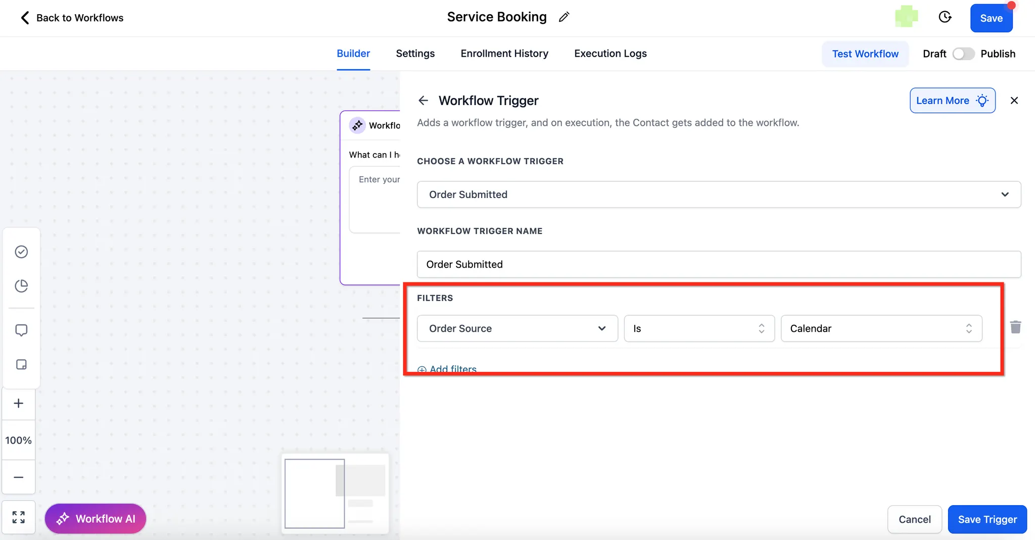Dit zorgt ervoor dat workflows op basis van orders alleen worden uitgevoerd voor service-booking orders wanneer je dit expliciet wilt — door het filter Order Source = Calendar toe te voegen aan de Order Submitted trigger.