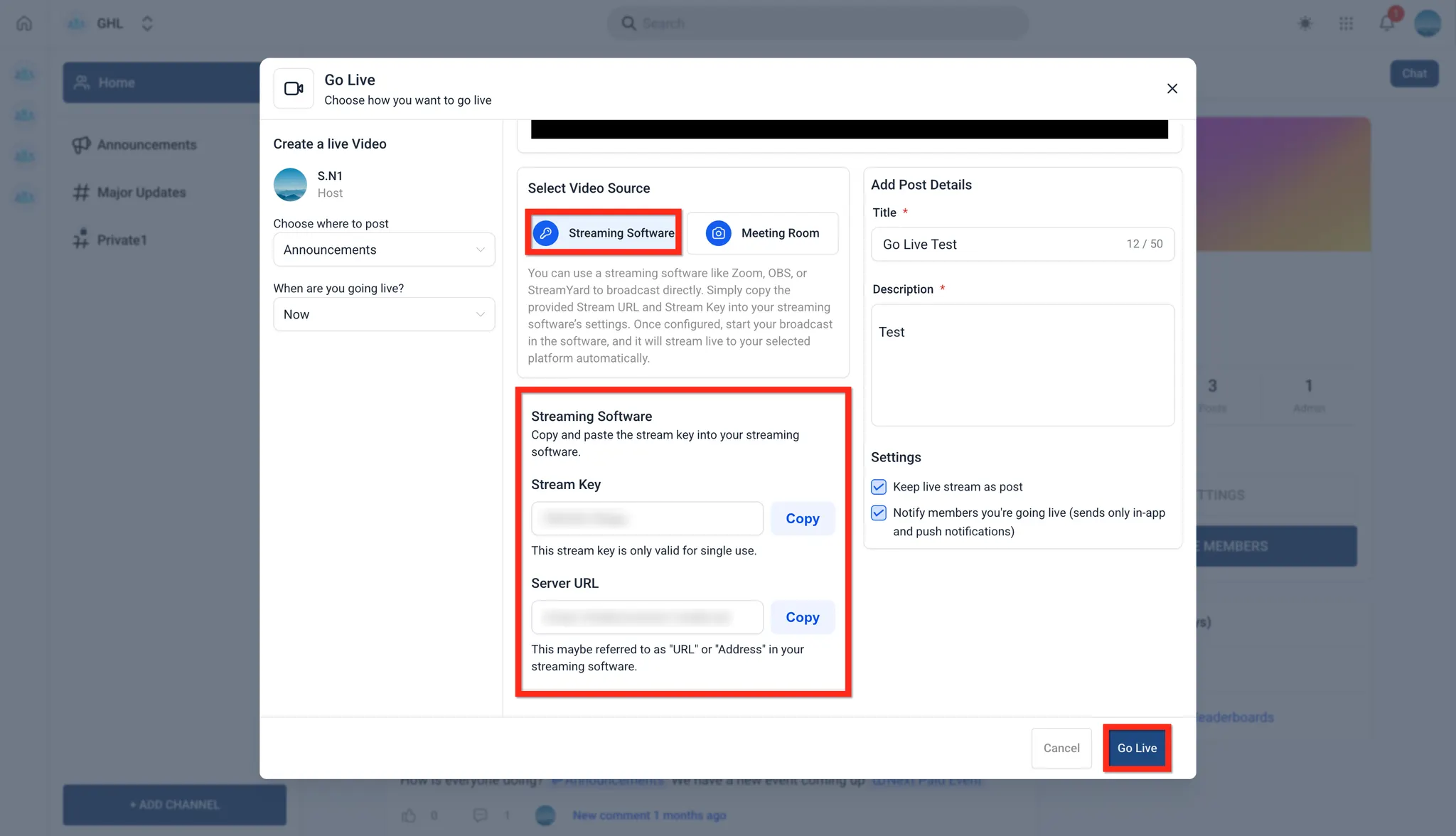 - Stream Software Modus: Een broadcast ervaring die verbinding maakt met externe tools zoals OBS, Zoom of StreamYard via Stream Key & URL terwijl kijkers kijken en chatten binnen je community.