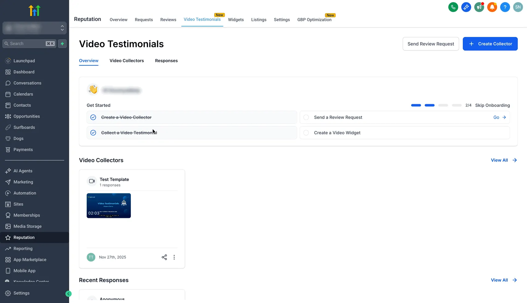 Video Testimonials is een Reputatiefunctie waarmee je video-reviews van klanten verzamelt via deelbare, gebrandde "Video Collectors." Contacten kunnen een video opnemen of uploaden vanaf desktop of mobiel (geen app nodig). De verzamelde video's kun je intern bekijken en op je website tonen via de Review Widget.