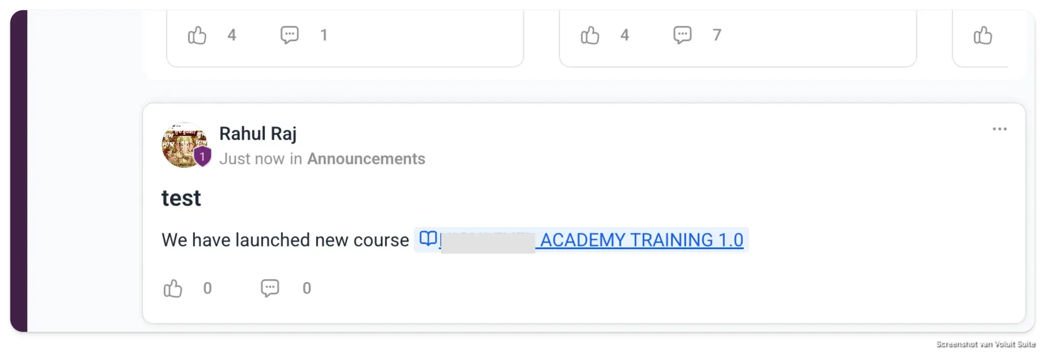 Elk lid dat een bericht of reactie kan maken in de groep, kan cursustags toevoegen. Toegang om de cursus te bekijken na het klikken hangt af van de configuratie van de cursus.