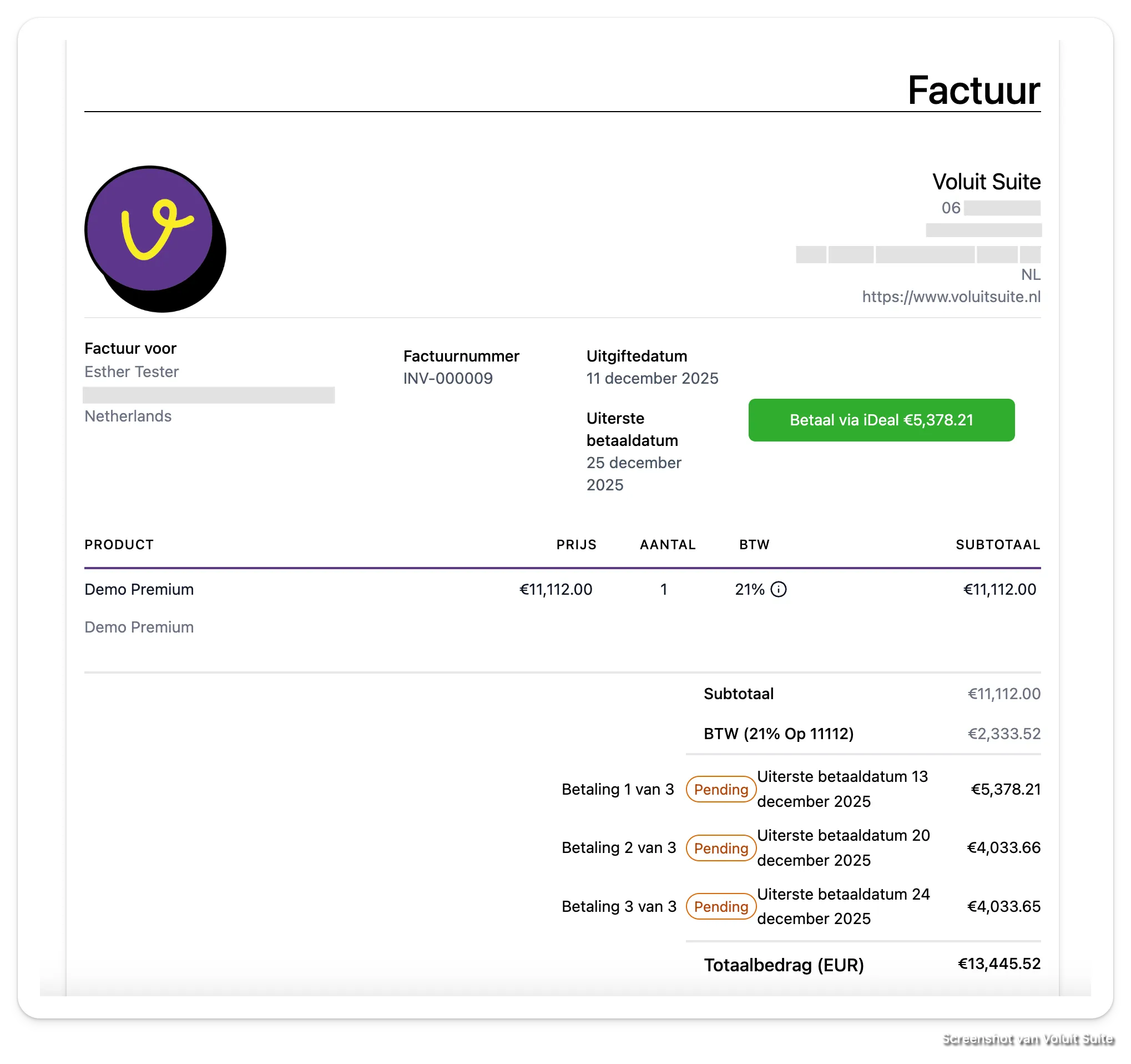 De ontvanger ziet de factuur met de mogelijkheid om de eerste termijn te betalen.
