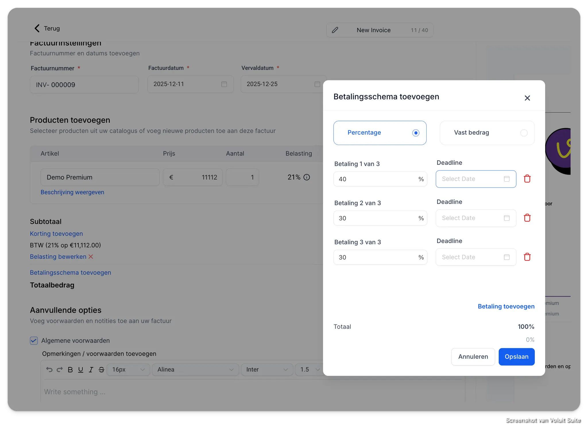 Stel de betalingsvoorwaarden in met een percentage of vast bedrag en verstuur de factuur