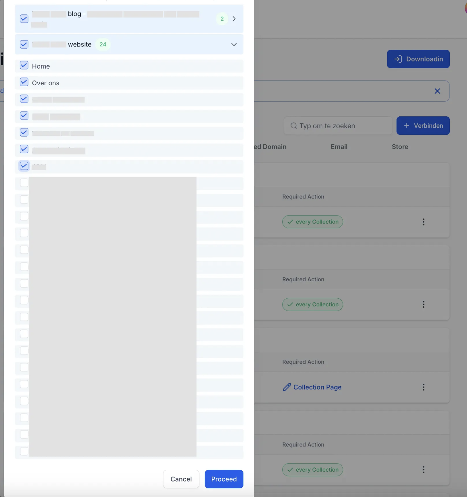 Zodra je klaar bent om naar de volgende stap te gaan, klik je op de knop "Doorgaan" of “Proceed” onderaan de lijst met websites en funnels.