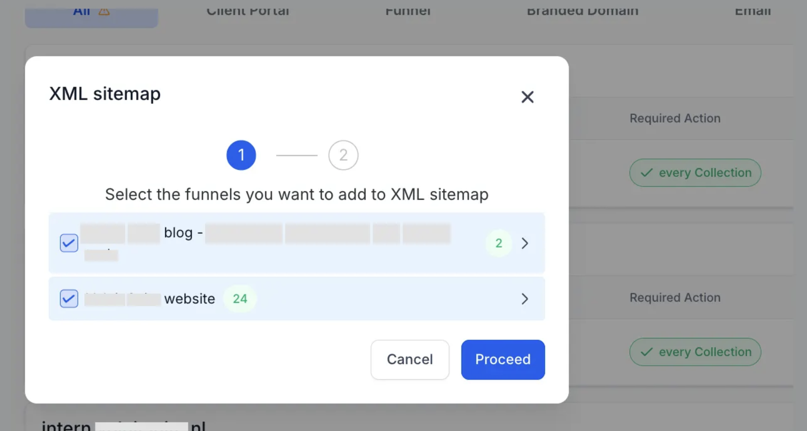 - Selectievakje: Het selectievakje aan de linkerkant van de website of funnel naam stelt je in staat om de hele website of funnel te selecteren en alle pagina's aan de XML sitemap toe te voegen.