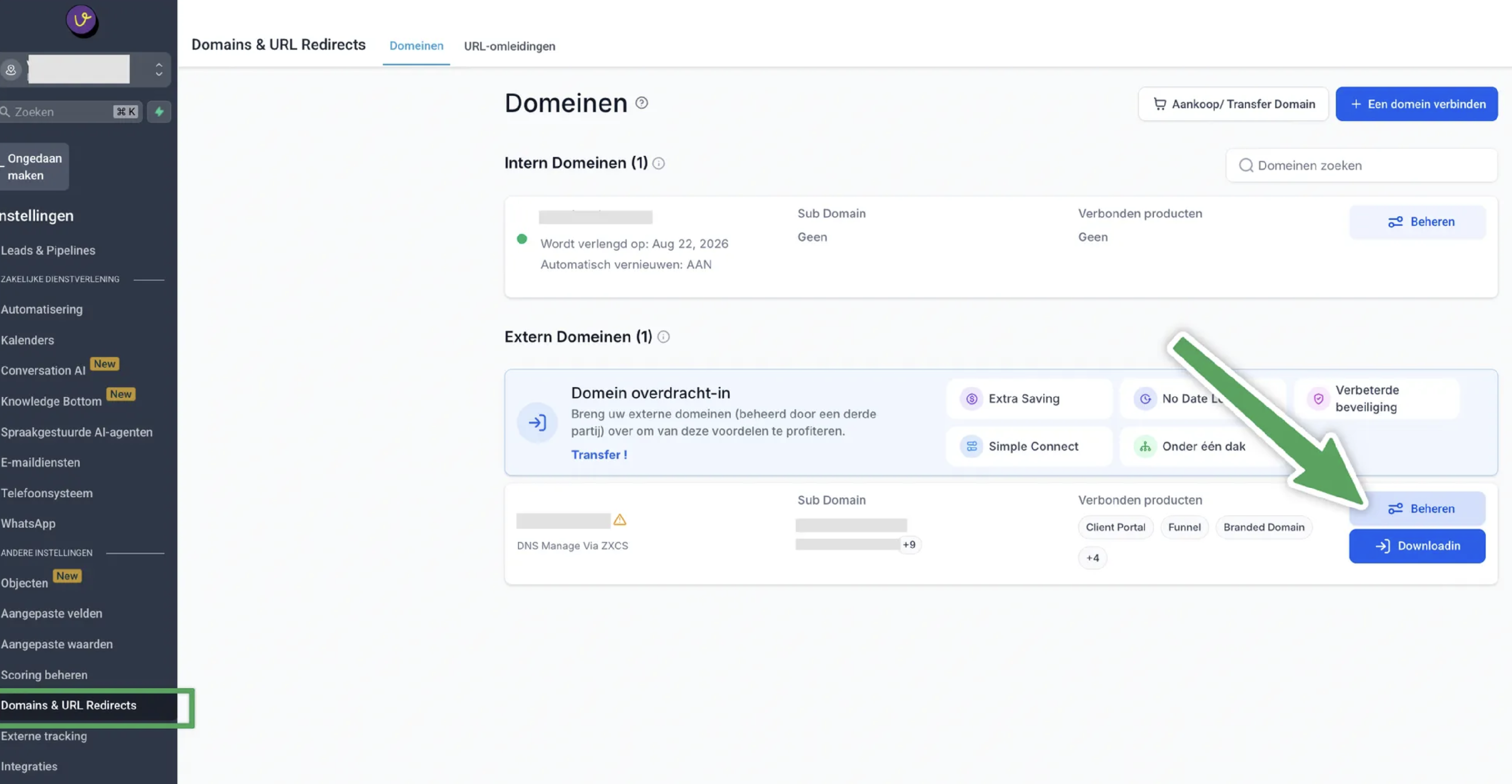 Ga naar menu Instellingen > Domeinen & URL redirects. Selecteer het gewenste domein (als je er meerdere hebt) en klik op de knop ‘Beheer’.