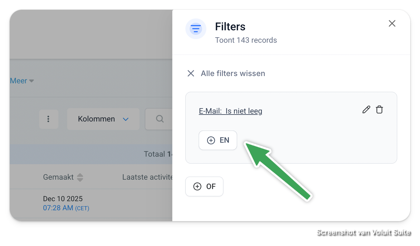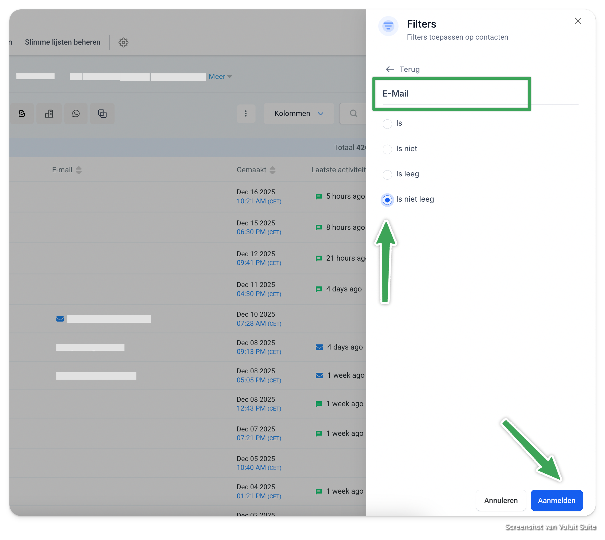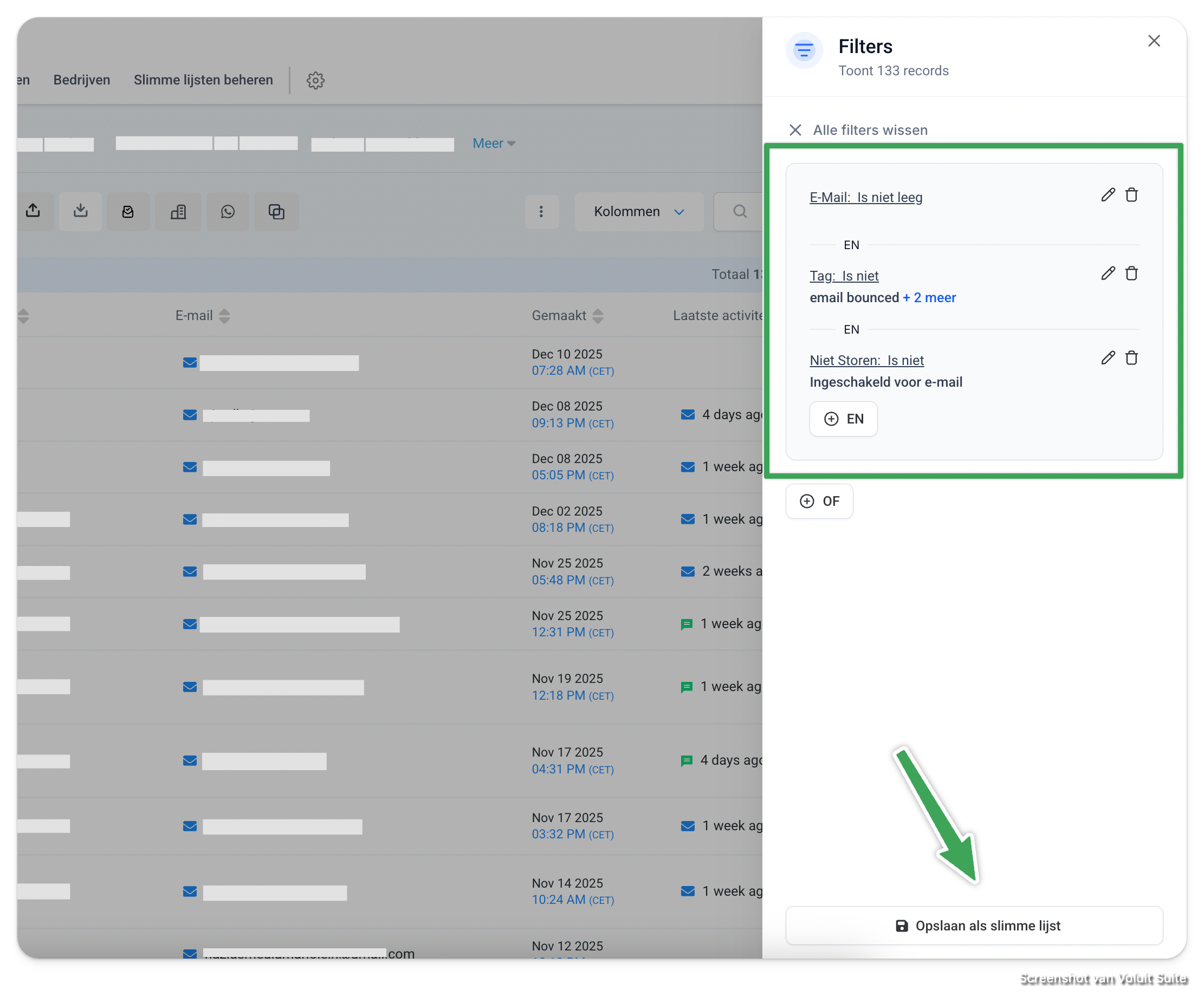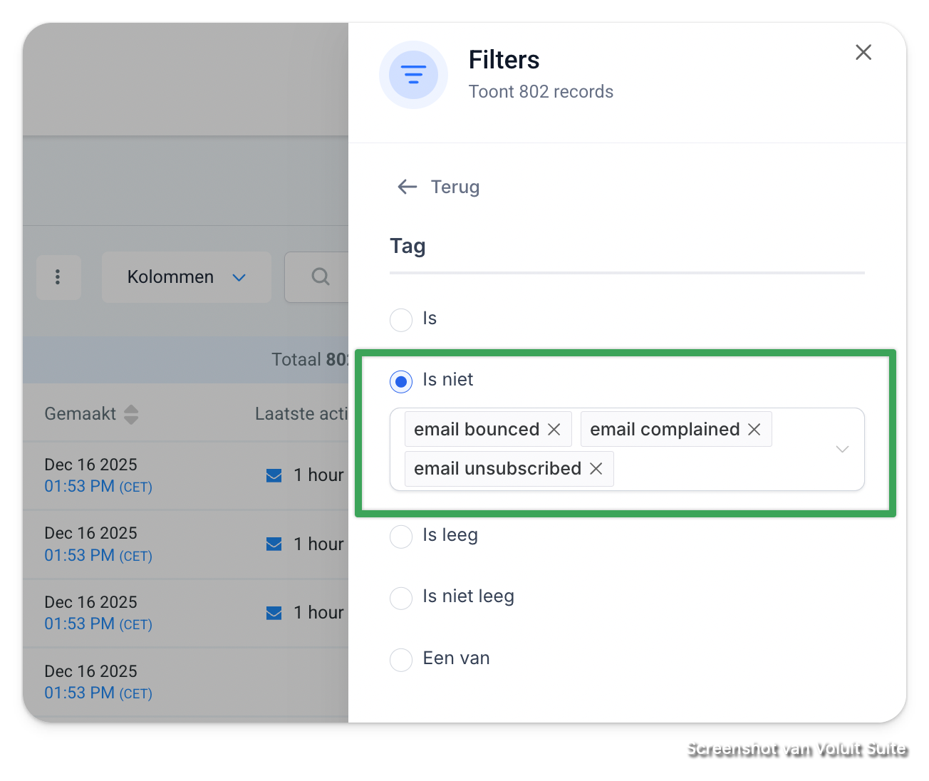 - Email is niet leeg - Als je je FB en Insta integratie aan hebt staan heb je ook veel contacten in je CRM zonder email adres. Daar wil je niet naar toesturen dus die filter je er uit.