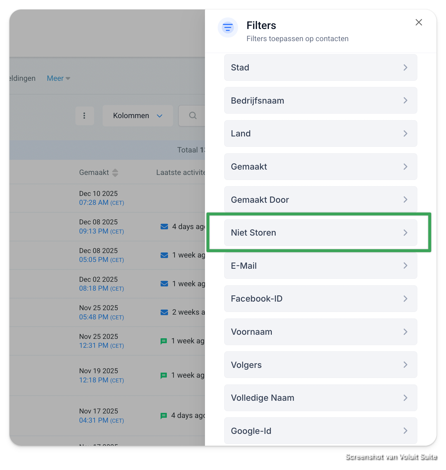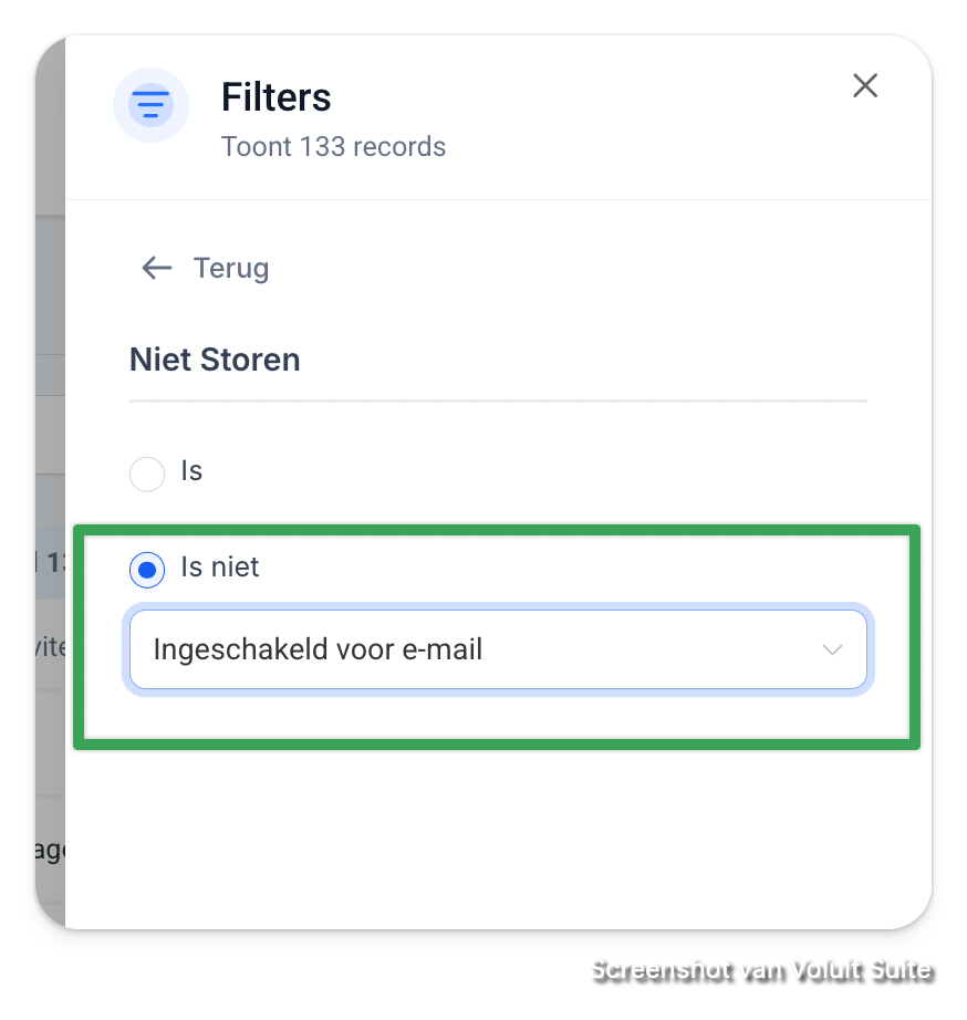 - Niet storen mag niet aan staan voor email - Dit wordt aangezet in de workflows als iemand zich uitschrijft, klaagt of als de mail bounced. Niet storen noemen we ook wel DND in het systeem. Dat staat voor Do not disturb. Als DND aan staat kan het Voluit Suite systeem technisch niet mailen naar die persoon dus dit is een harde grens.