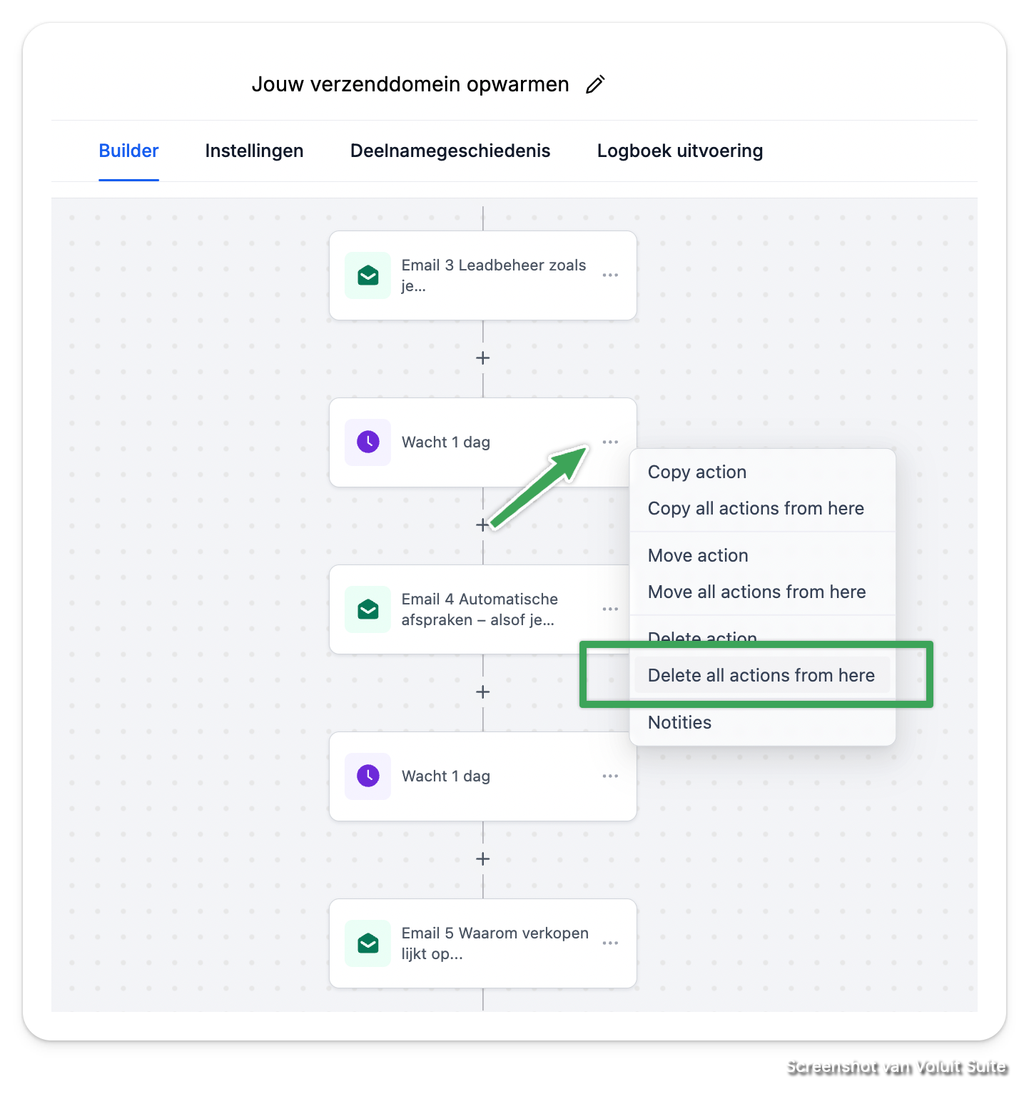 Heb je de bestaande workflow "Jouw verzenddomein opwarmen" gekopieerd dan haal je de rest van de mails en wachtstappen weg.