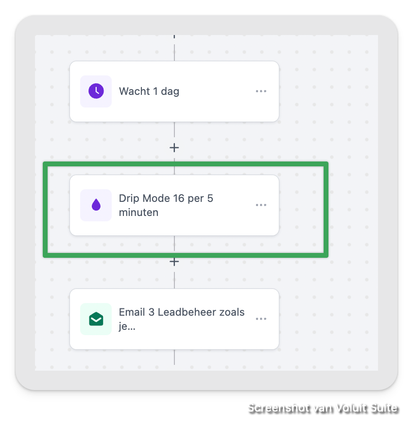 De actie Drip mode/ Druppelsgewijs voeg je toe vlak voor elke opwarmmail in je workflow.