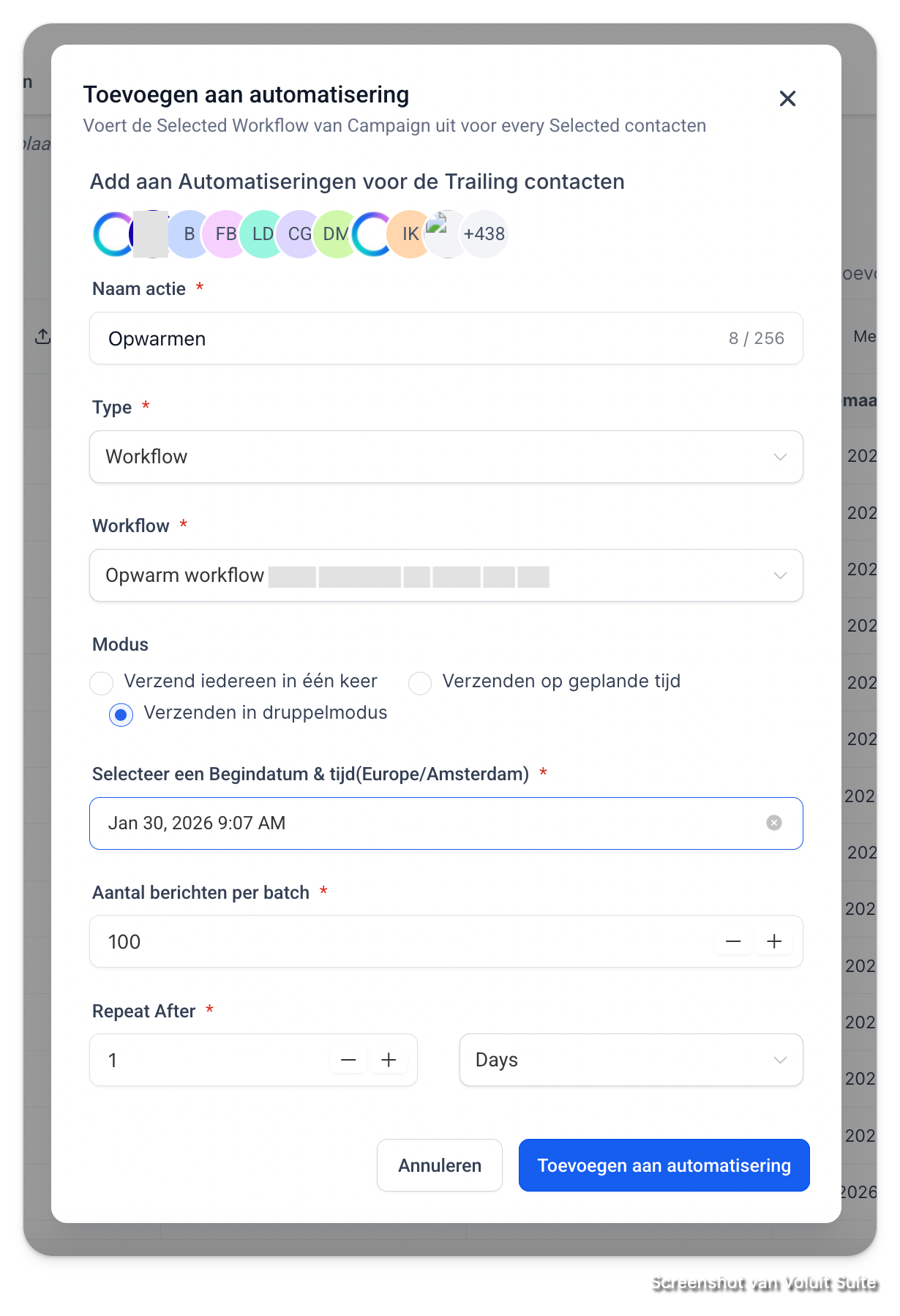 - Batch size: begin met 100-200 contacten per dag