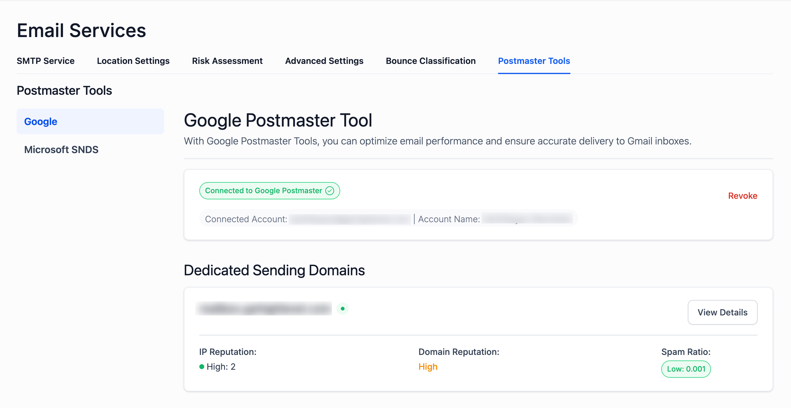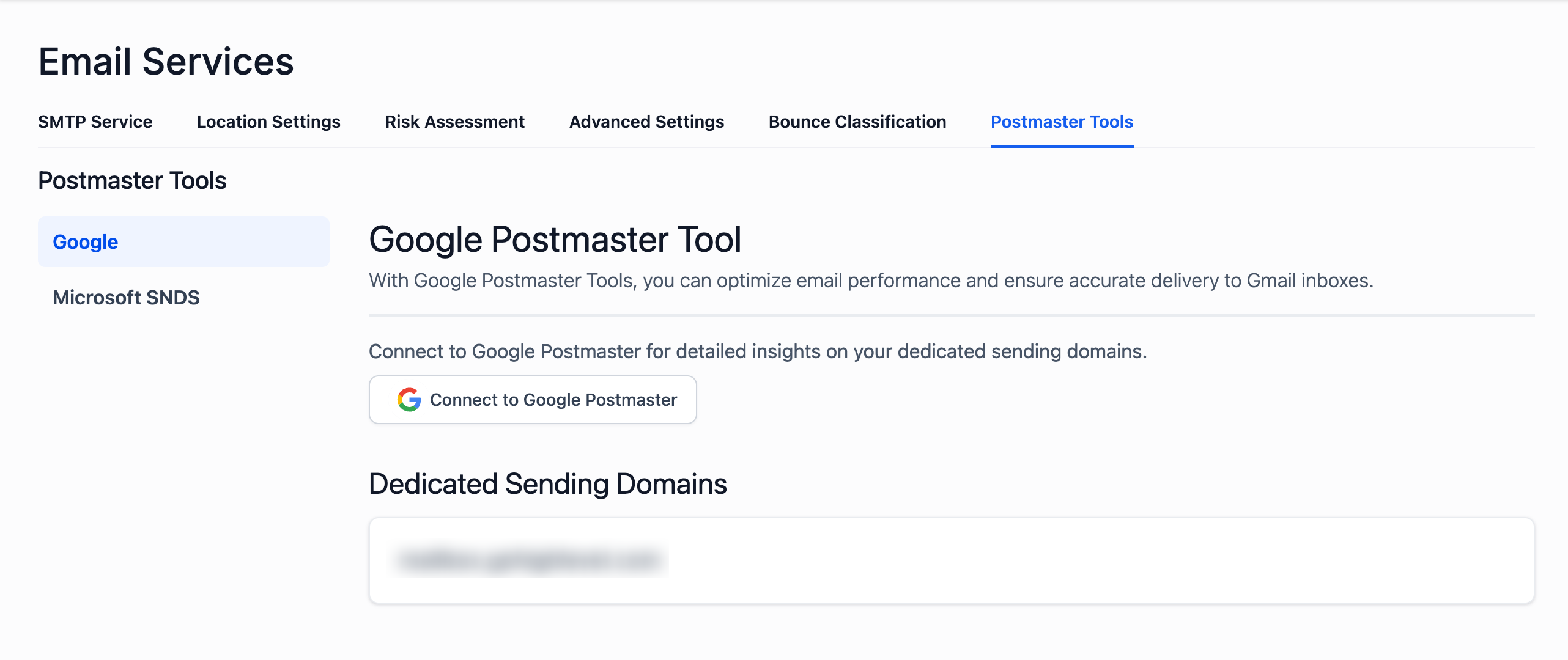 - Klik op de Connect to Google Postmaster knop. Dit verbindt je account met Google Postmaster Tools, waardoor je Postmaster metrics direct in je account kunt volgen en weergeven.