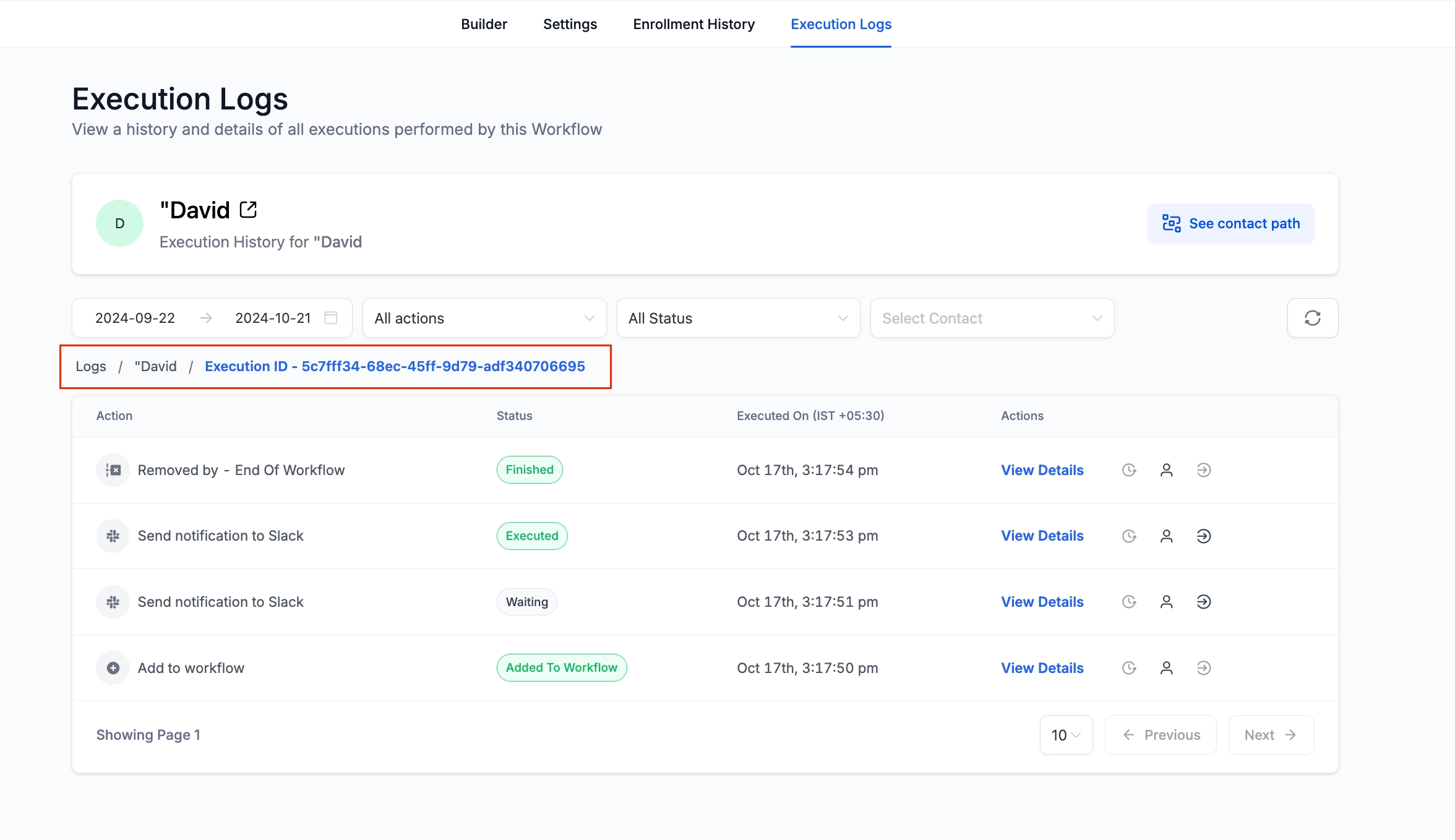 - Je gaat naar Contact History door op het pictogram View Contact History in Execution Logs te klikken.