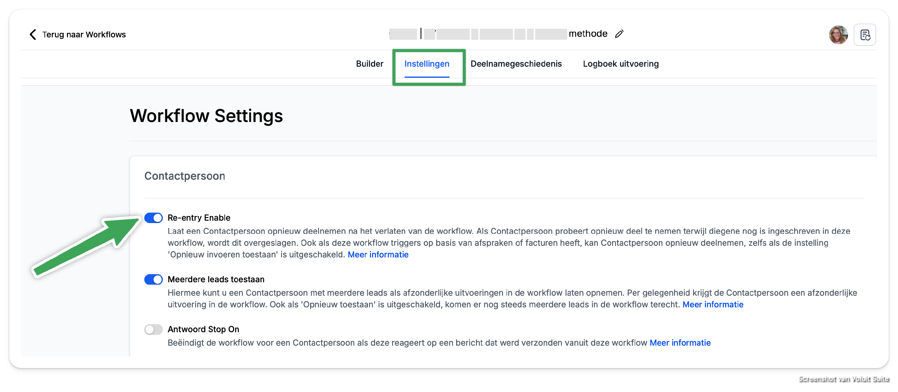 Dit stel je in in de instellingen van een workflow. Deze optie staat standaard aan (dus contacten kunnen meerdere keren de workflow doorlopen). Als je wil dat elk contact maximaal 1 x door de workflow heen gaat zet je deze switch uit.
