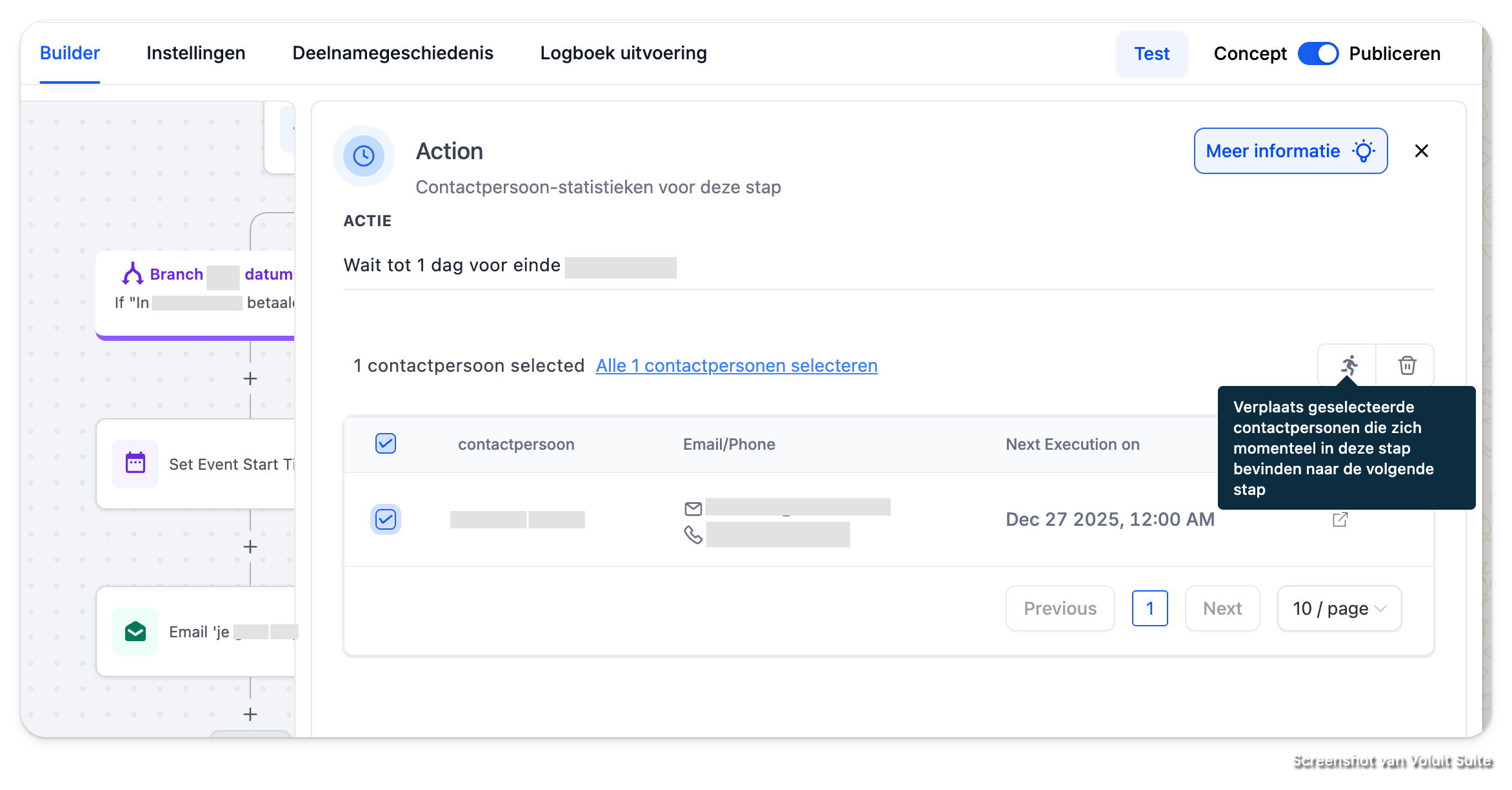 Selecteer een contact en klik op "Test uitvoeren" om de workflow te testen